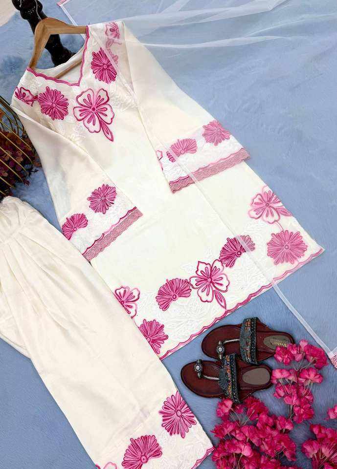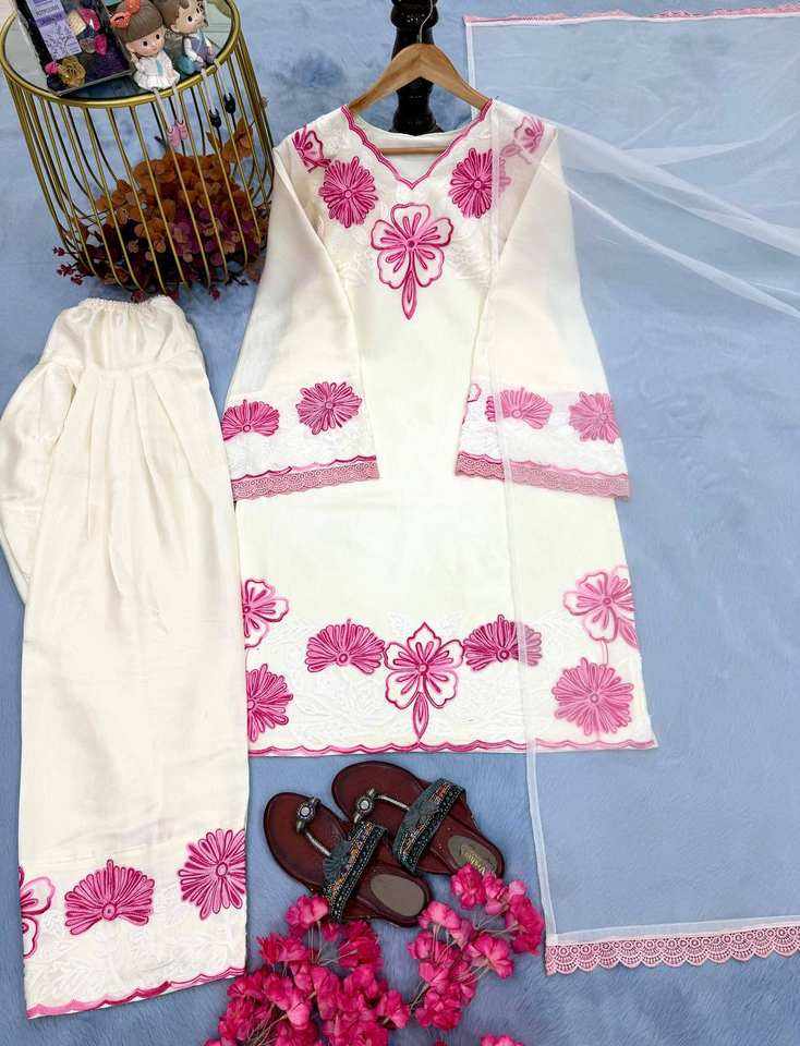 Ensemble prêt-à-porter moderne indien-pakistanais de créateur pour fêtes/mariages, en soie Chinon satinée, comprenant haut, pantalon et dupatta, avec broderies lourdes