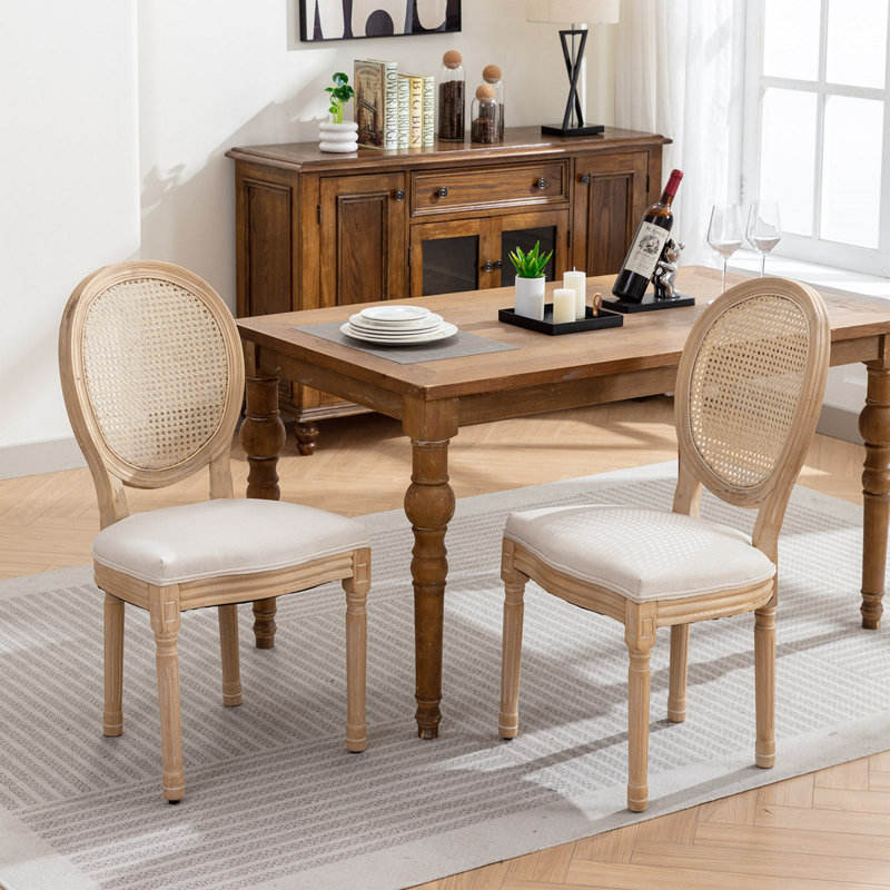Ensemble 2 chaises de salle à manger modernes avec cadre en bois massif et dos en rotin, tissu de lin et chaises rembourrées avec peinture antique