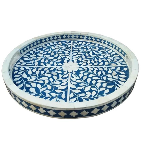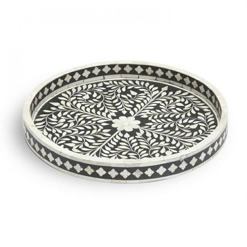 Plateau de service décoratif moderne en bois avec incrustations d'os et poignée, idéal pour le thé, le café, les boissons froides et les collations