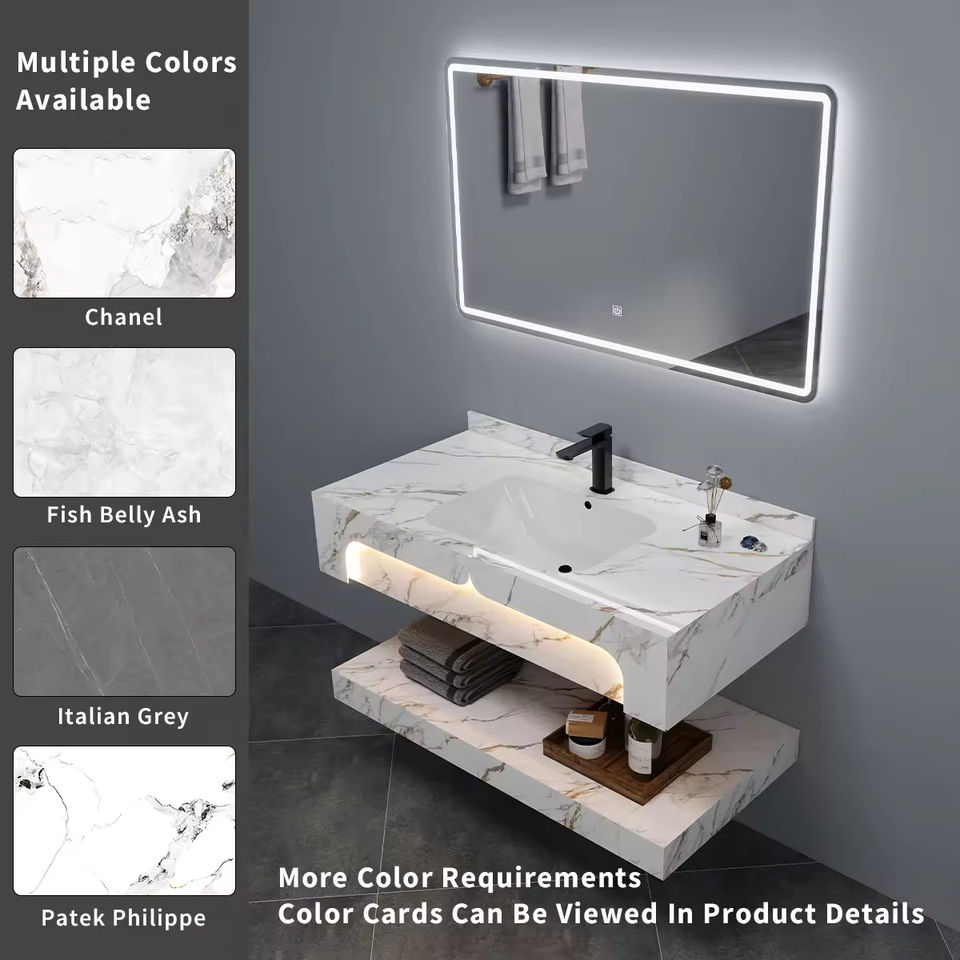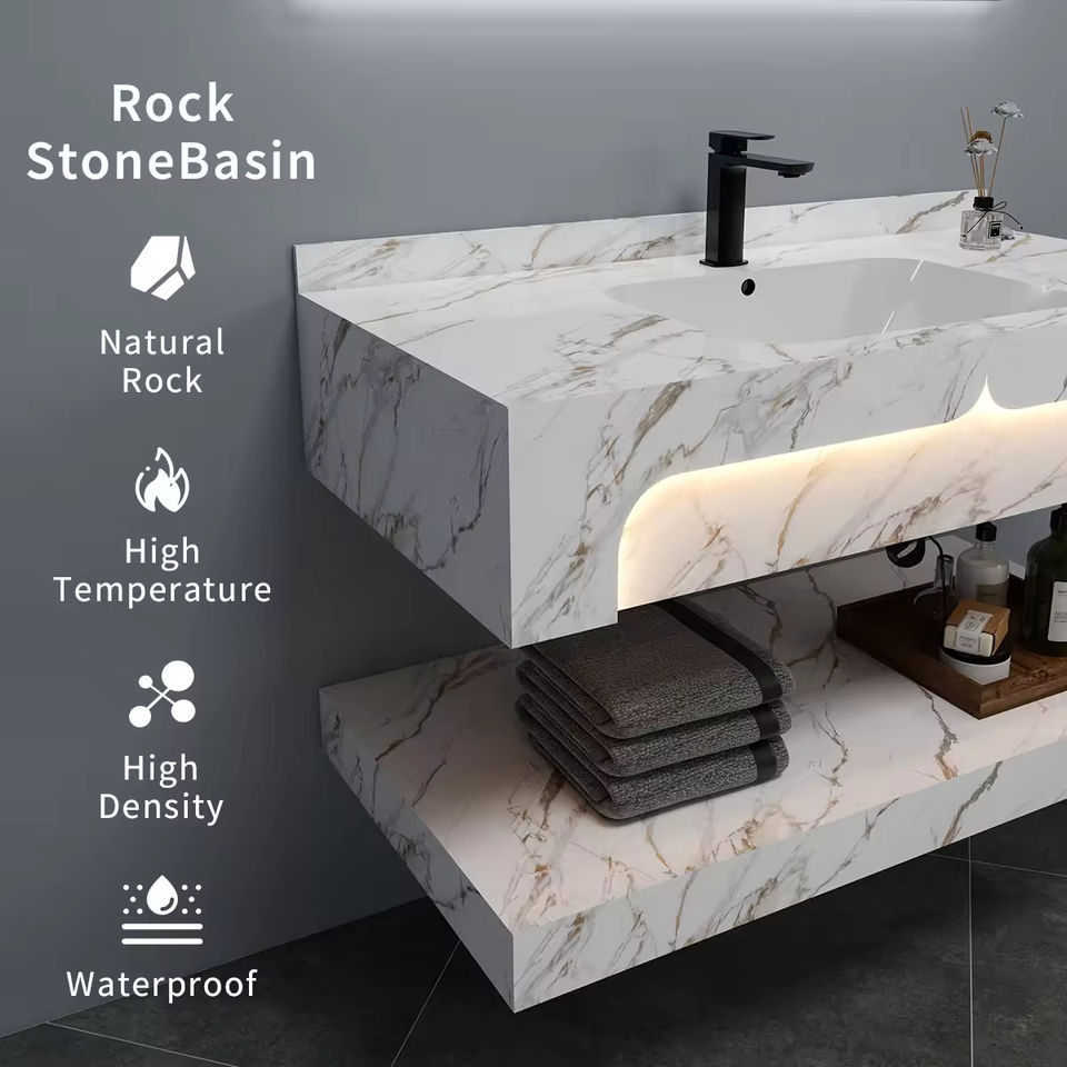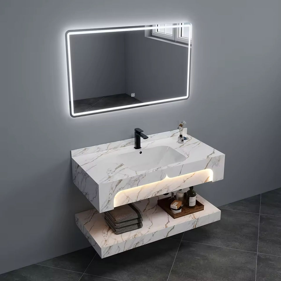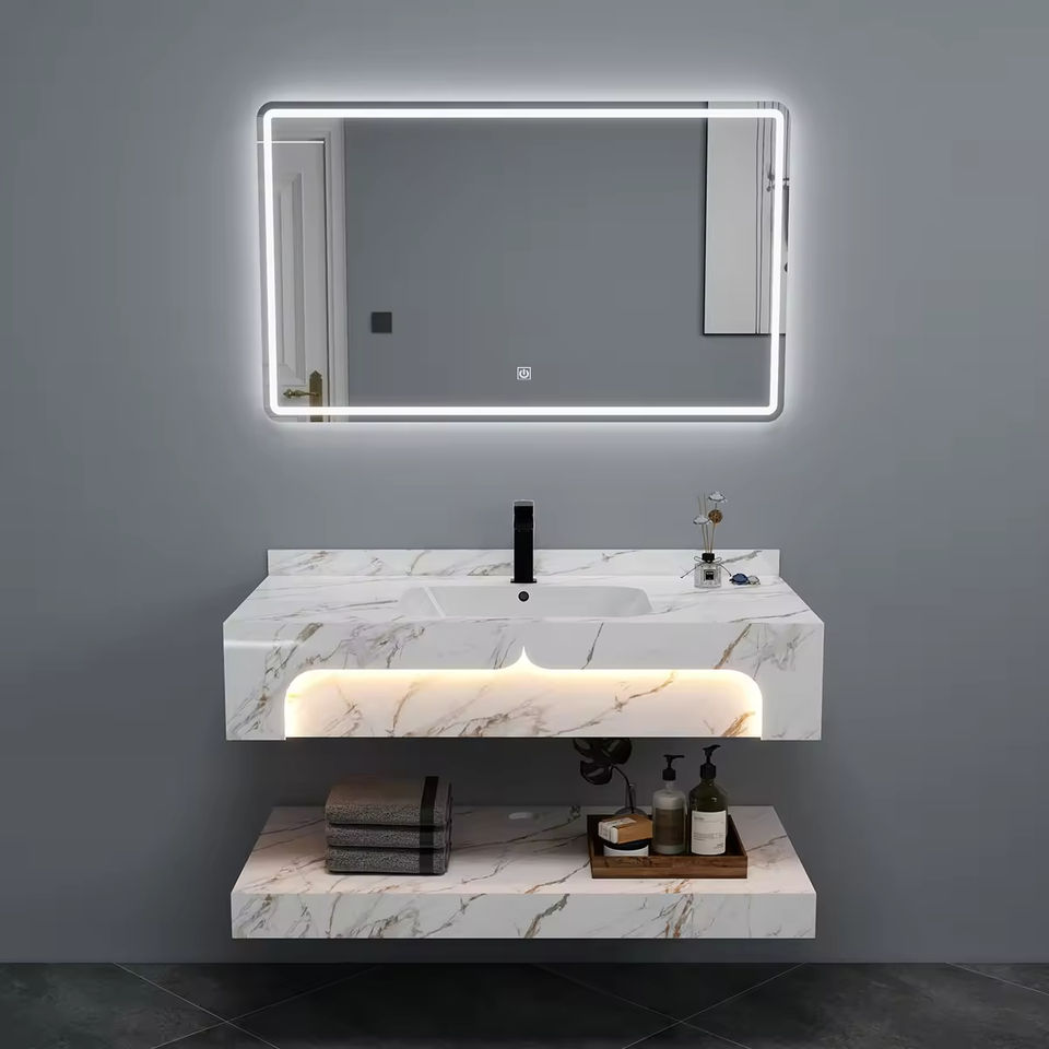 Lavabo double en marbre rectangulaire de qualité hôtelière avec LED pour villa et chambre à coucher
