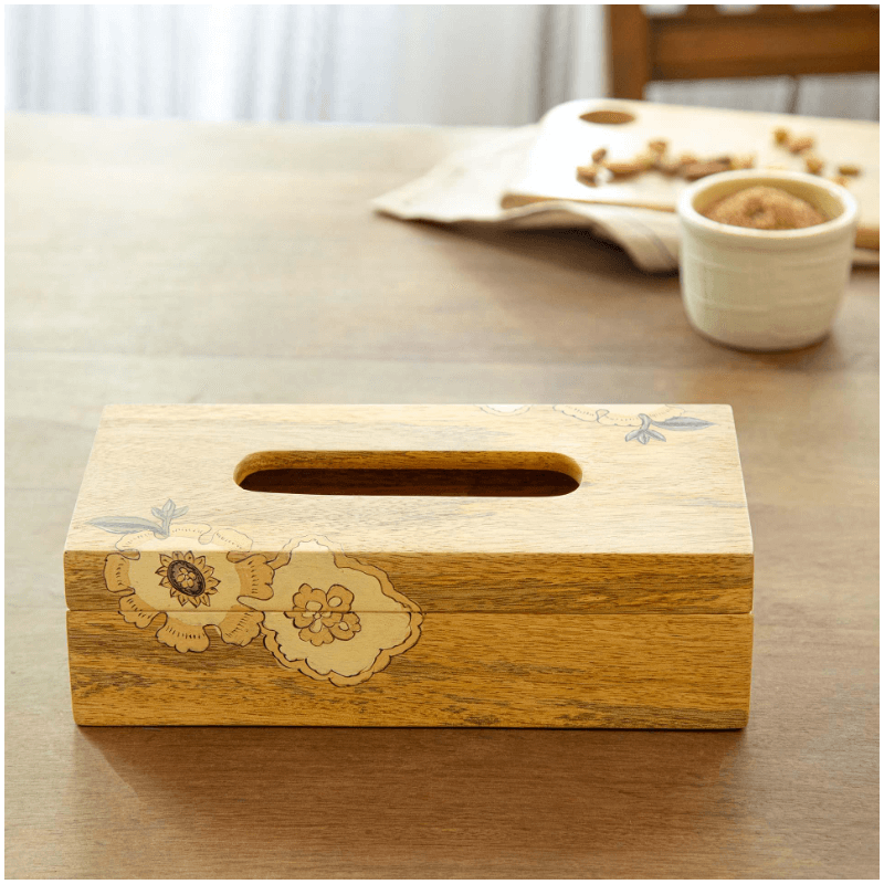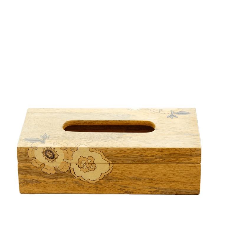Boîte à mouchoirs rectangulaire en bois naturel moderne et durable avec couvercle en bois décoratif de sculptures florales pour la maison ou le bureau