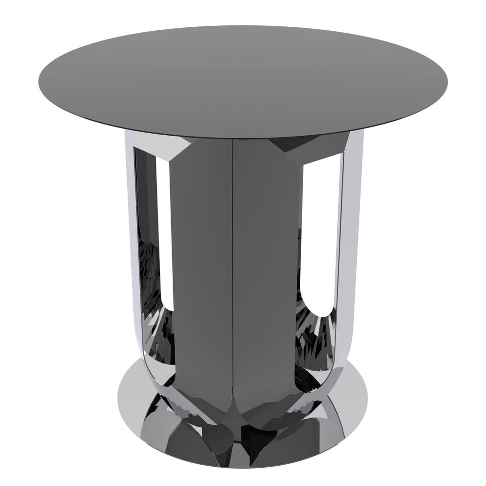 Table basse ronde moderne et durable en métal avec base sculpturale en acier inoxydable, plateau noir mat, modèle Metal Drake pour salons