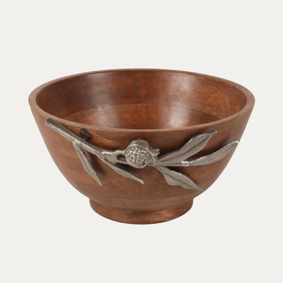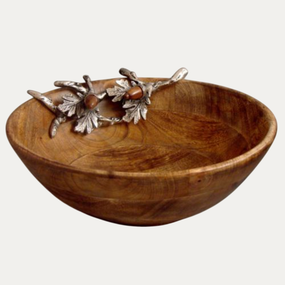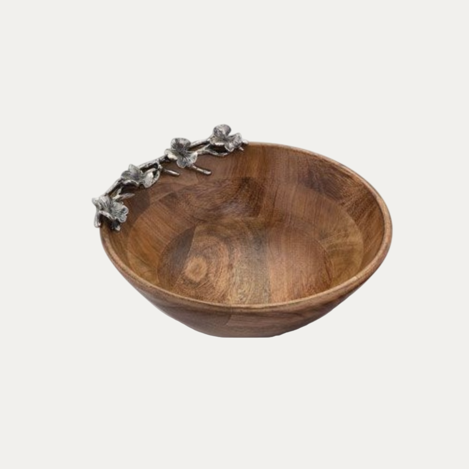Saladier rond moderne et écologique en bois de manguier avec bordure florale argentée pour mariages et autres occasions