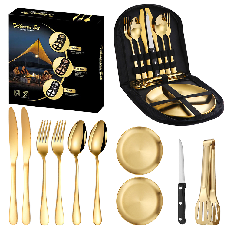 Ensemble de couverts de camping pour 2 personnes en acier inoxydable écologique moderne avec motif paysager, vaisselle résistante au four et au lave-vaisselle, pour pique-nique et voyage