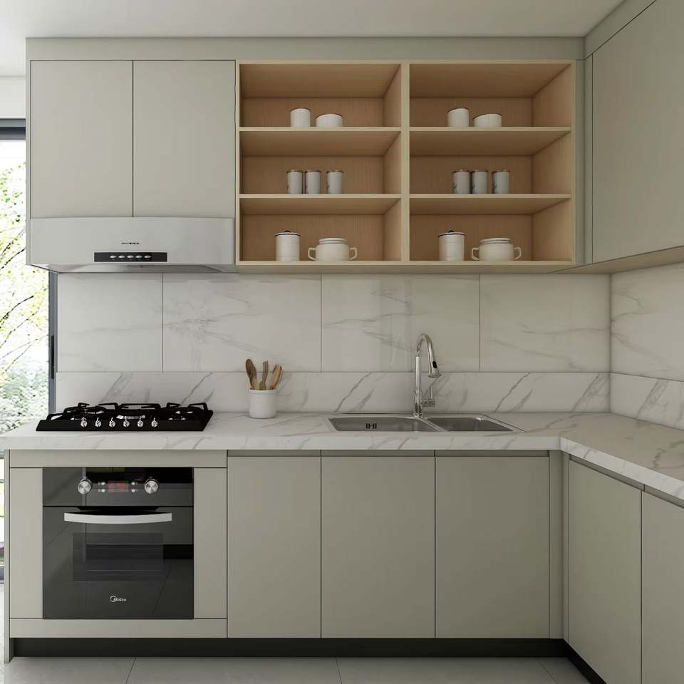 Cuisine moderne et élégante avec plan de travail en marbre, design propre et lumineux, disposition fonctionnelle et espace de rangement ample