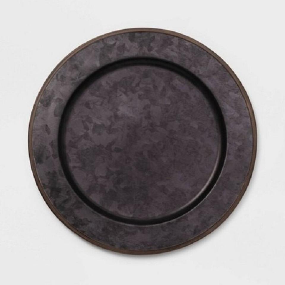 Assiette de présentation noire moderne en relief avec motif de volutes dorées ornées et bordure baroque perlée pour les fêtes de Noël et du Ramadan