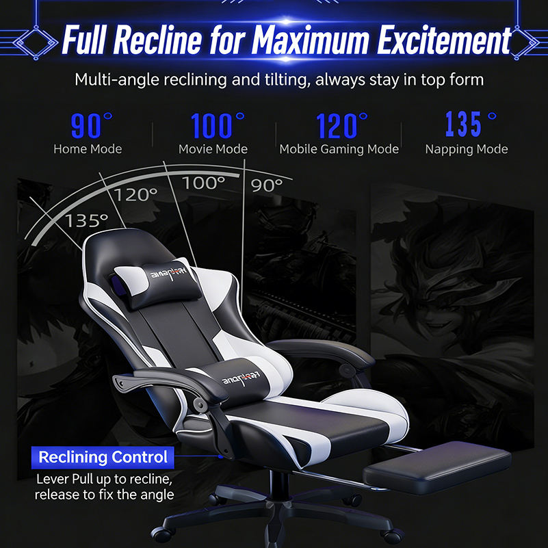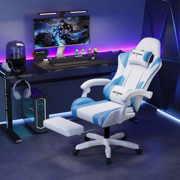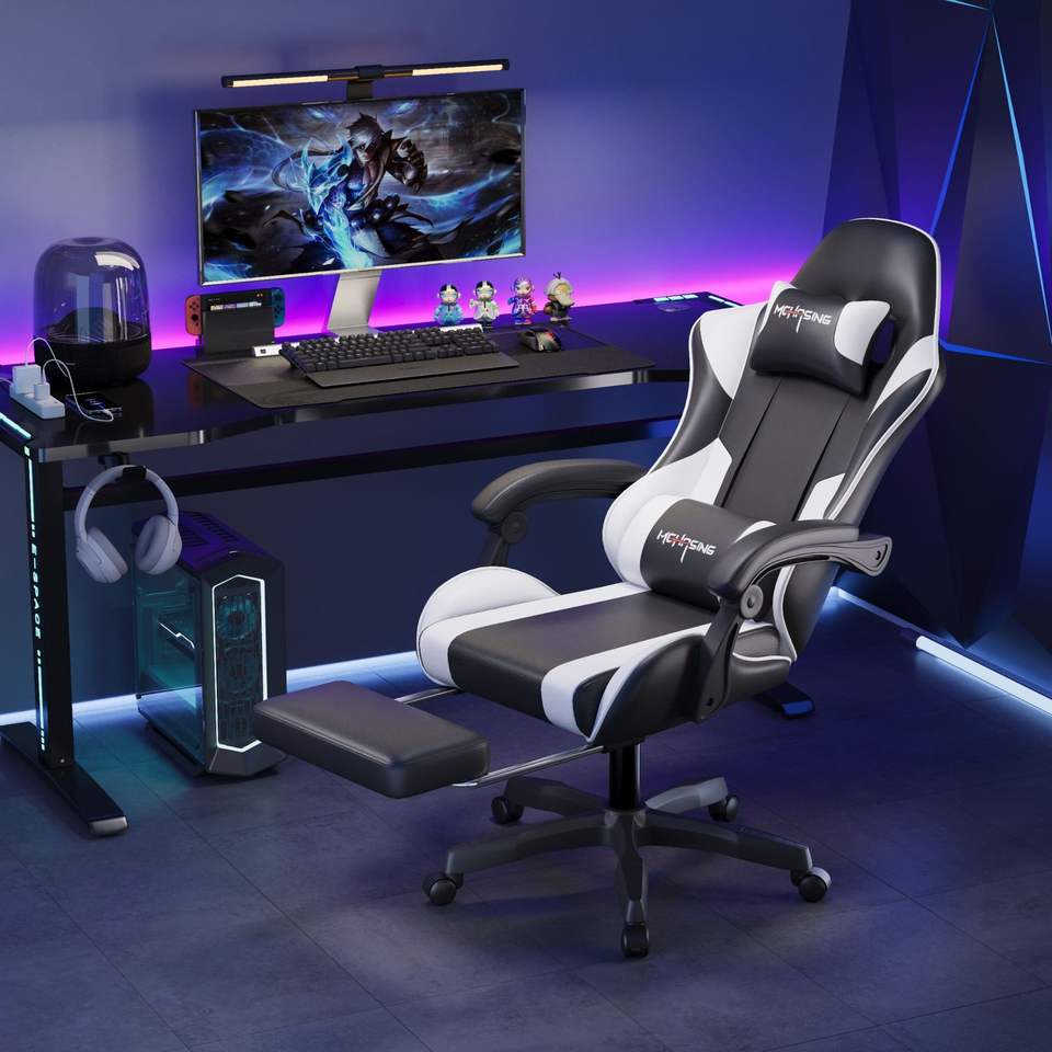 Chaise de jeu ergonomique moderne de style course, dossier haut, pivotante, réglable en hauteur, avec support lombaire et appui-tête, pour bureau et e-sport