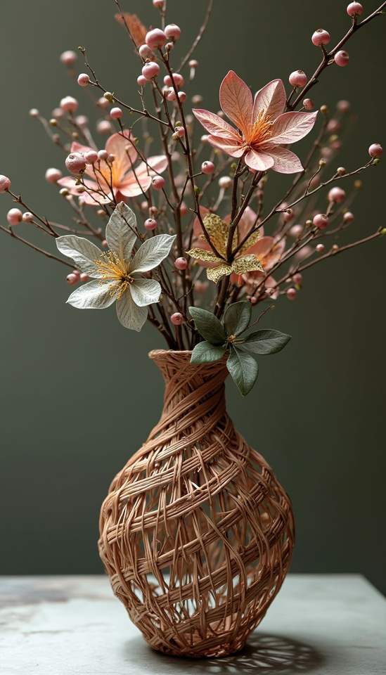 Vase à fleurs en rotin de ferme moderne avec détails rustiques, idéal pour les cuisines de salle à manger et les décorations de maison confortables et confortables