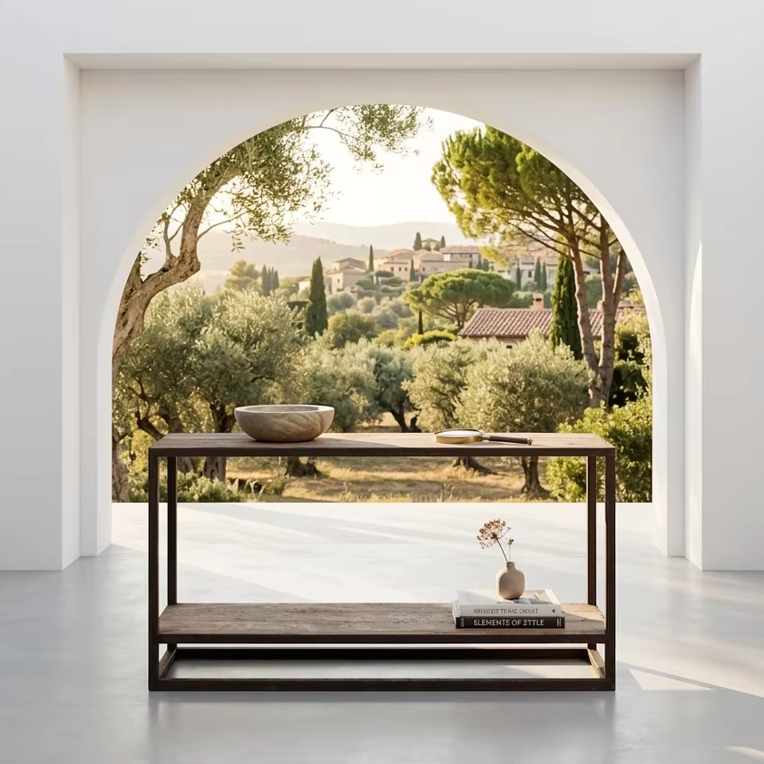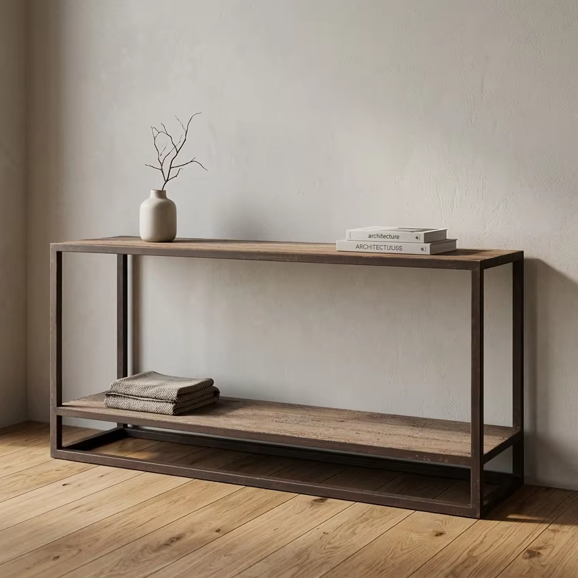 Table d'appoint moderne Federa, console longue avec plateau en bois et structure en fer, style loft urbain, pour entrée, appartement, salon, écologique