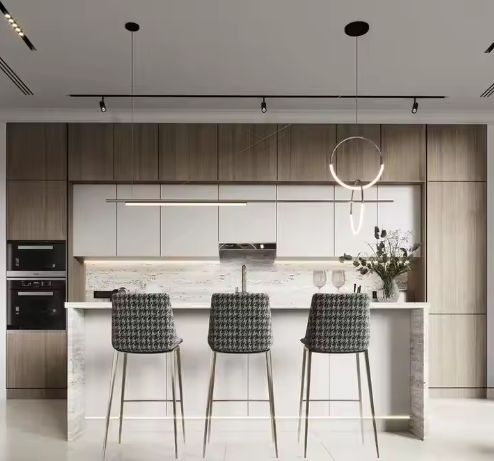 Armoires de cuisine modernes en placage de bois, technologie à panneaux plats, structure en MDF, porte en verre, comprenant un évier et un robinet pour appartement