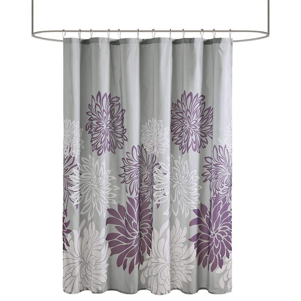 Rideau de douche moderne en polyester à imprimé floral, décoration de salle de bain imperméable avec ensemble de 4 pièces par Chen, design gris et violet