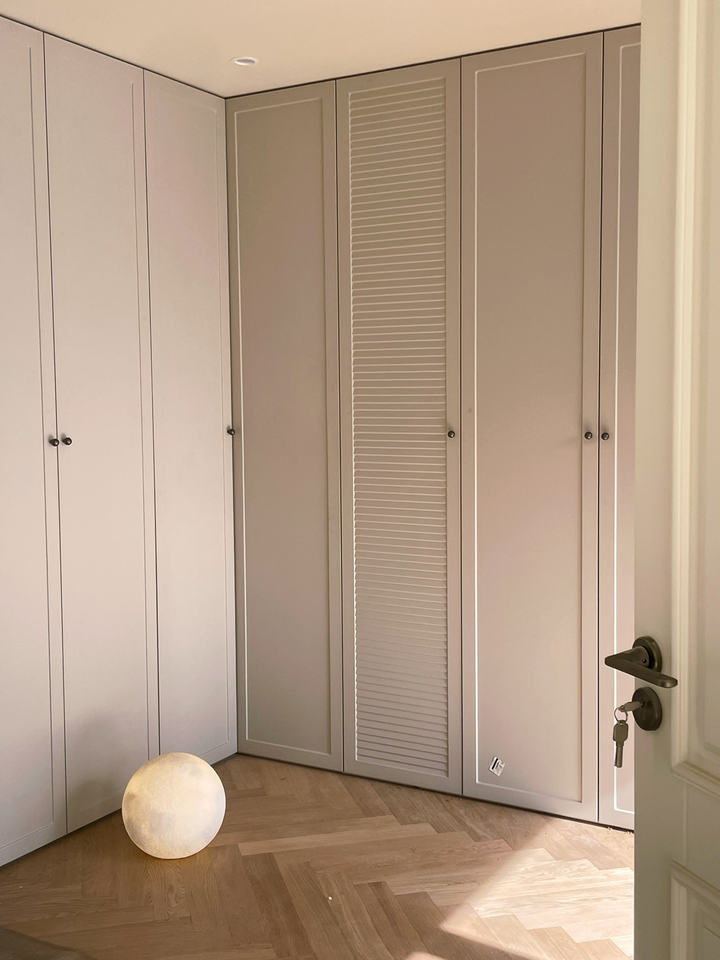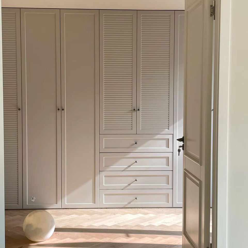 Système d'armoire Balom moderne à la française Portes unies à persiennes Tiroirs intégrés Rangement personnalisable Chambre à coucher Meubles de maison