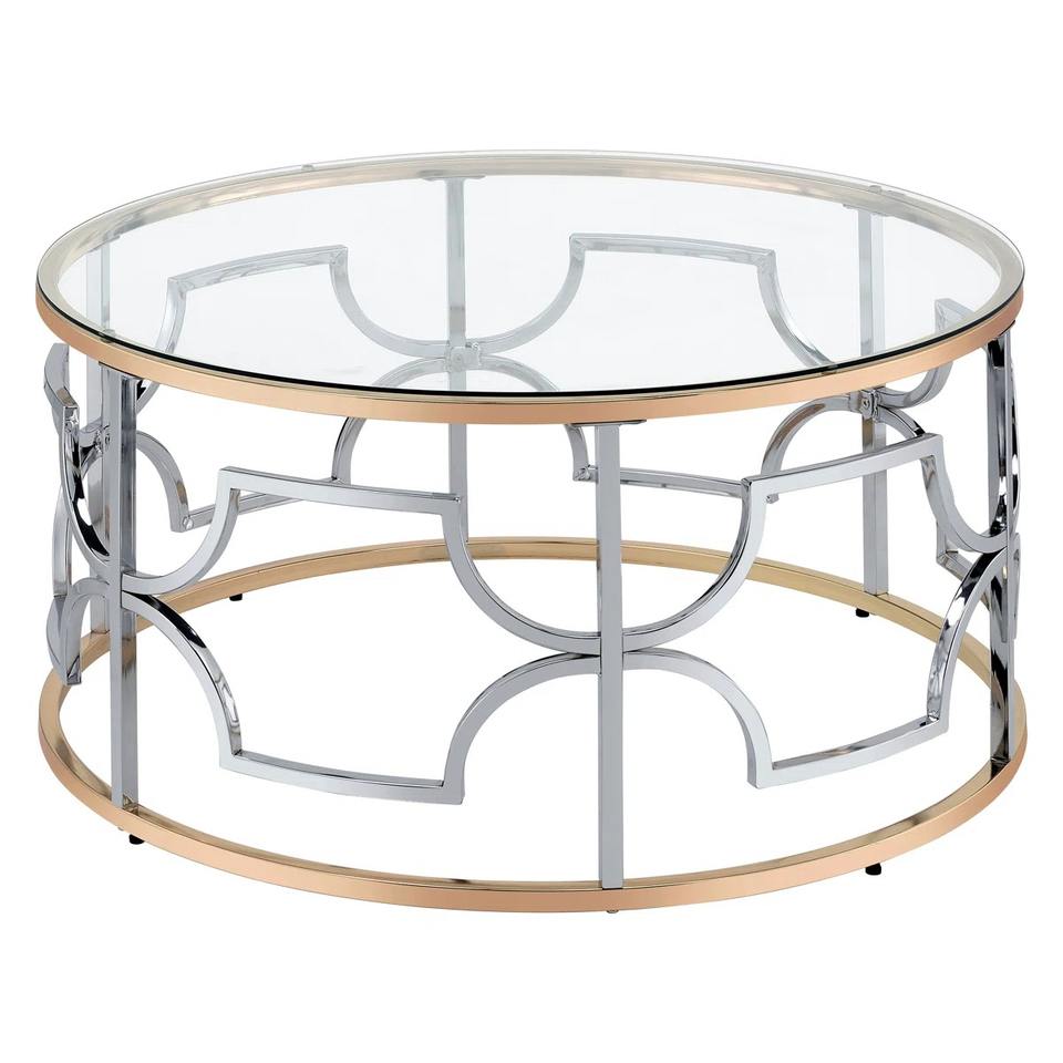 Table basse moderne écologique avec cadre en métal nickel poli et plateau en verre pour le salon