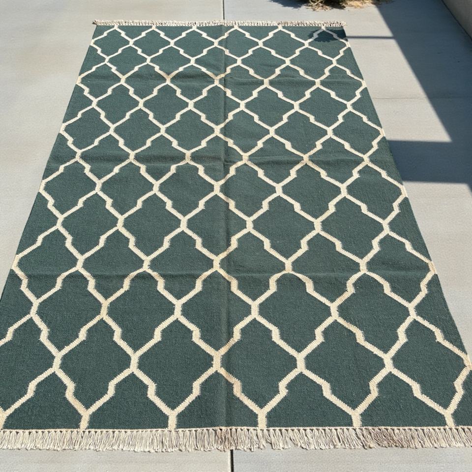 Tapis en laine tissé plat géométrique moderne, motif treillis Ogee, vert sarcelle et blanc, Kilim contemporain réversible, vert chasseur, tapis d'appoint écologique
