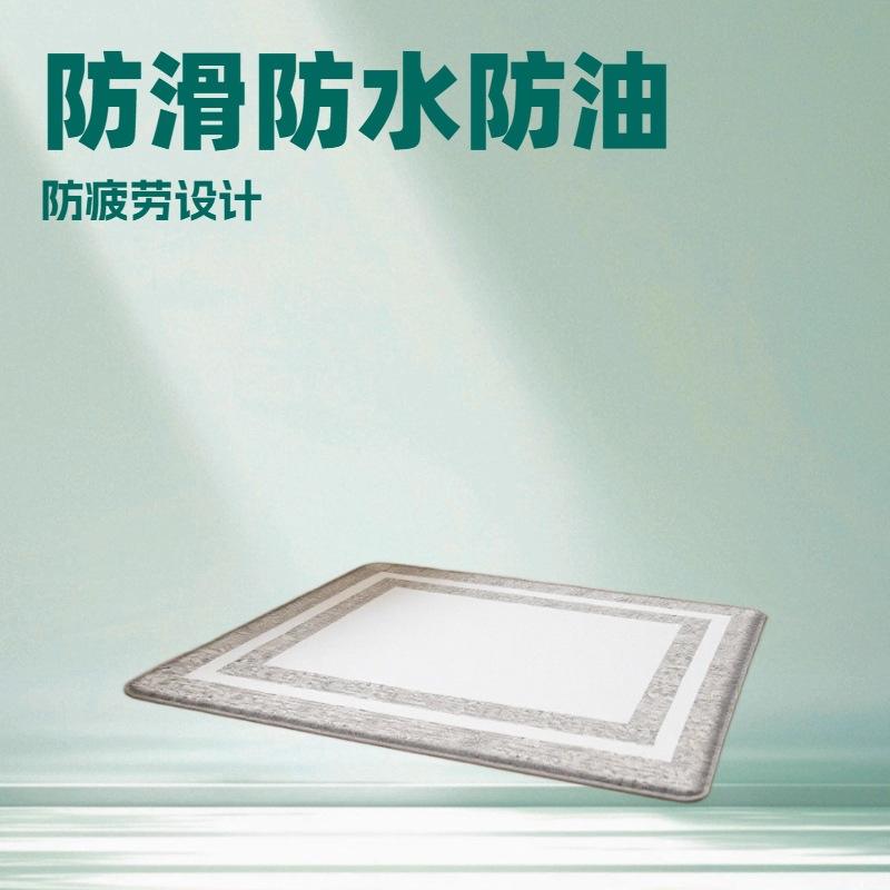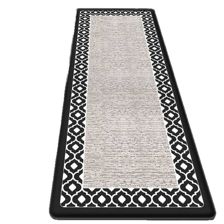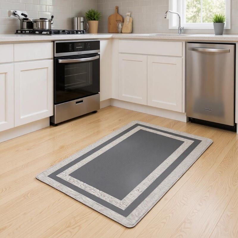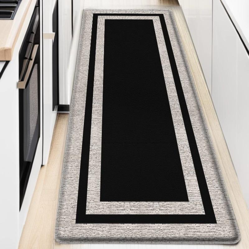 Tapis de cuisine géométrique moderne rectangulaire en PVC, anti-fatigue, imperméable, antidérapant, gris clair avec bordure noire
