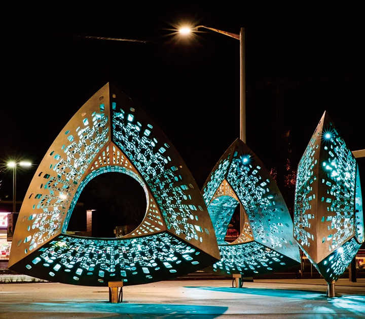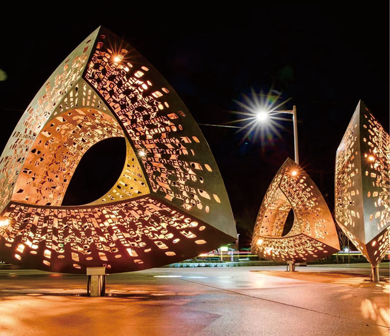 Ensemble de sculptures géométriques modernes en métal avec éclairage LED bleu-vert - Installation artistique extérieure pour la décoration paysagère de jardin