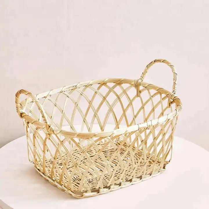 Panier à fruits rond géométrique moderne en fil de fer, organisateur de rangement en métal plaqué cuivre avec poignée pour la cuisine et la décoration de la maison