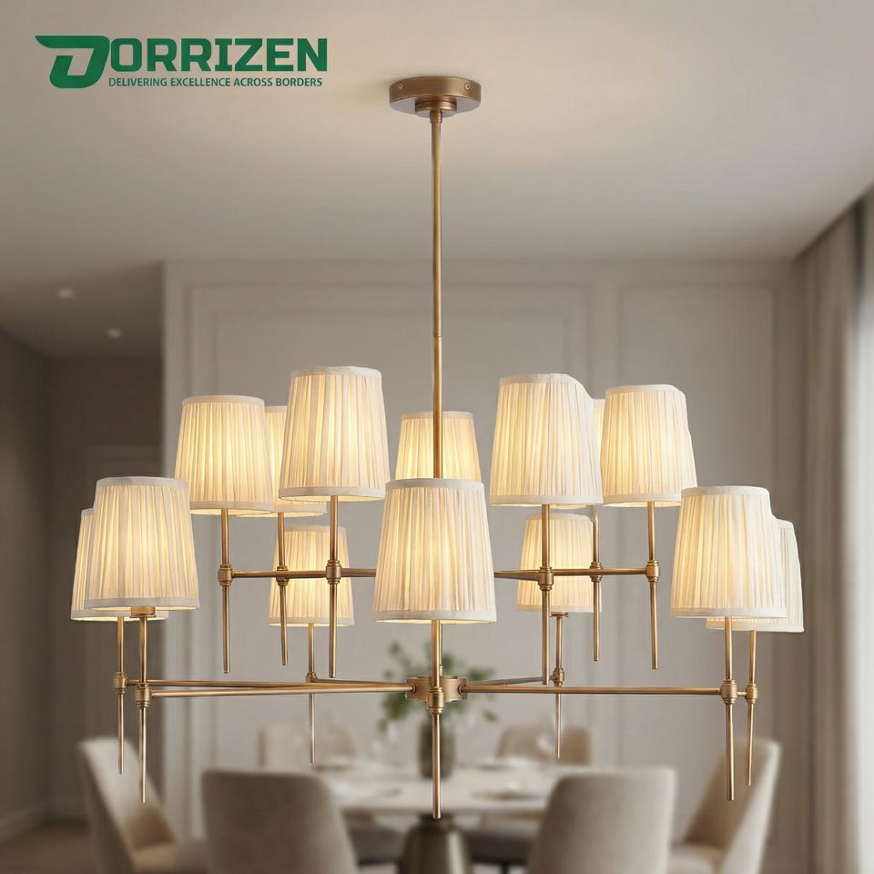Lustre suspendu LED moderne en fer doré avec abat-jour en tissu, personnalisable, blanc chaud, éclairage de luxe pour salle à manger et restaurant