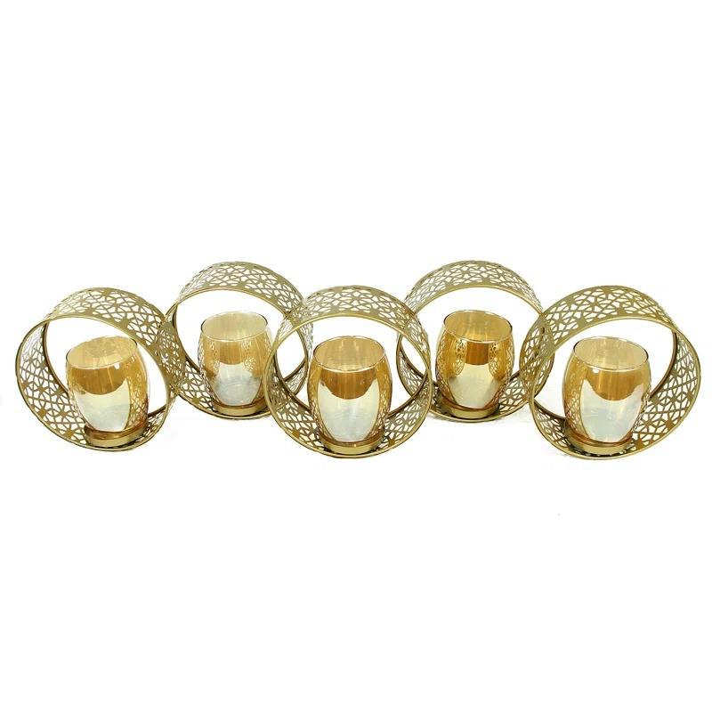 Candélabre moderne à 5 lumières en métal doré avec anneaux percés et votives en verre nacré