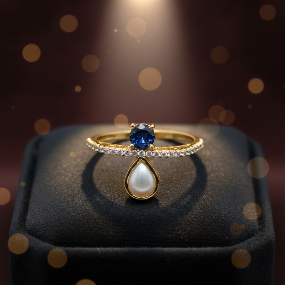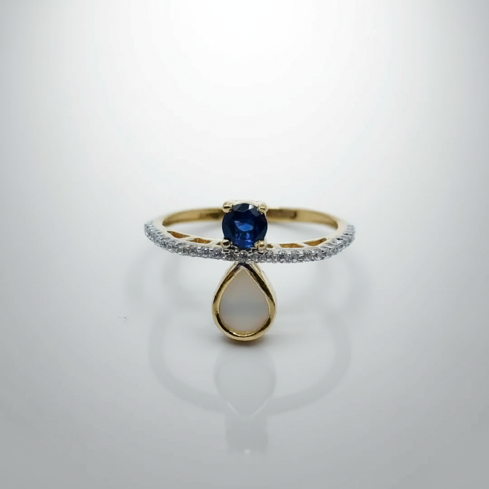 Bague en or moderne avec pierre précieuse bleue, bande ornée de diamants et breloque en forme de poire pour les mariages et les soirées