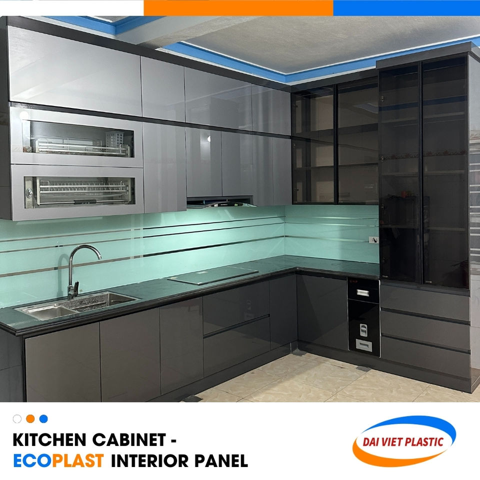 Armoire de cuisine moderne grise avec panneau intérieur en PVC Mobilier de maison d'exportation du Vietnam en bois et métal pour usage domestique