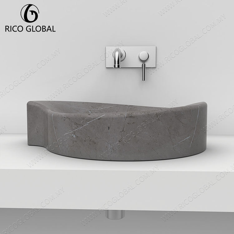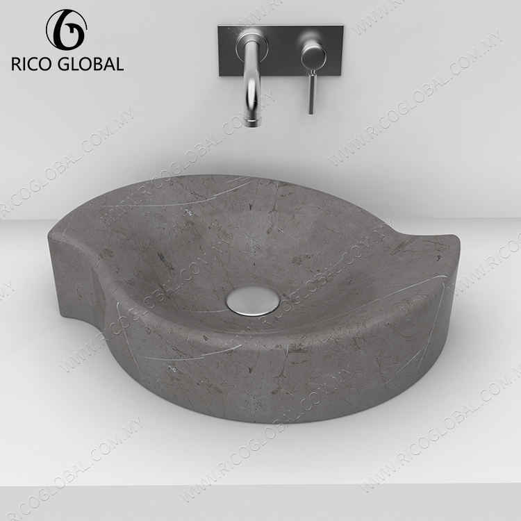 Lavabo en marbre gris moderne, forme irrégulière unique, rénovation de salle de bain haut de gamme, ovale, pierre naturelle, béton mat pour hôtels