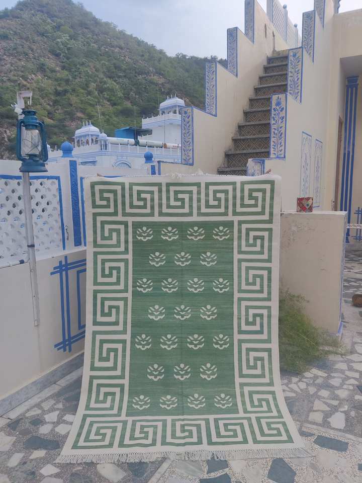 Tapisserie murale en coton réversible Dhurrie indien moderne fait à la main zone de tissage plat végétal naturel teint vert et blanc