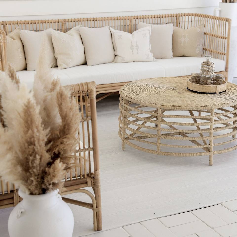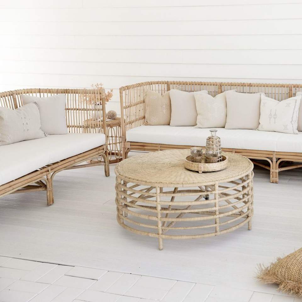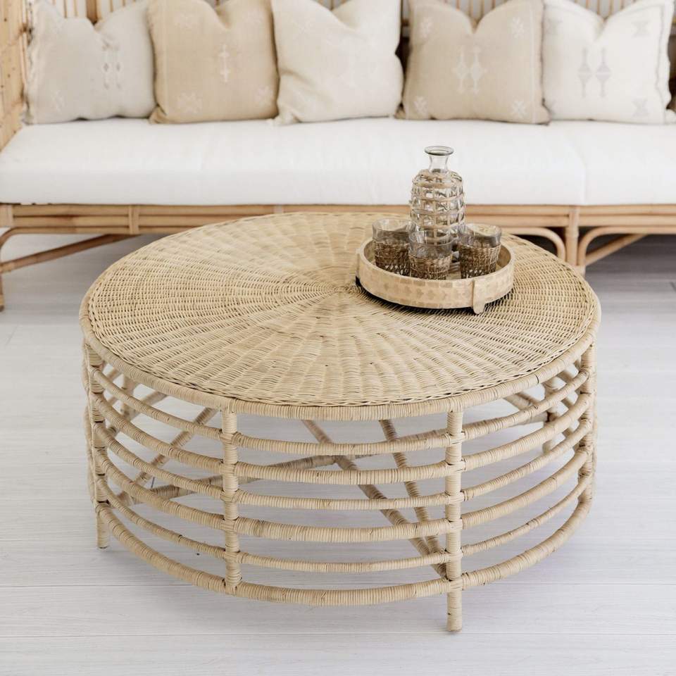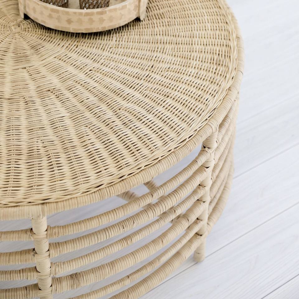 Table basse d'angle en rotin moderne faite à la main et écologique avec dessus de table en bois pour salon et meubles de maison