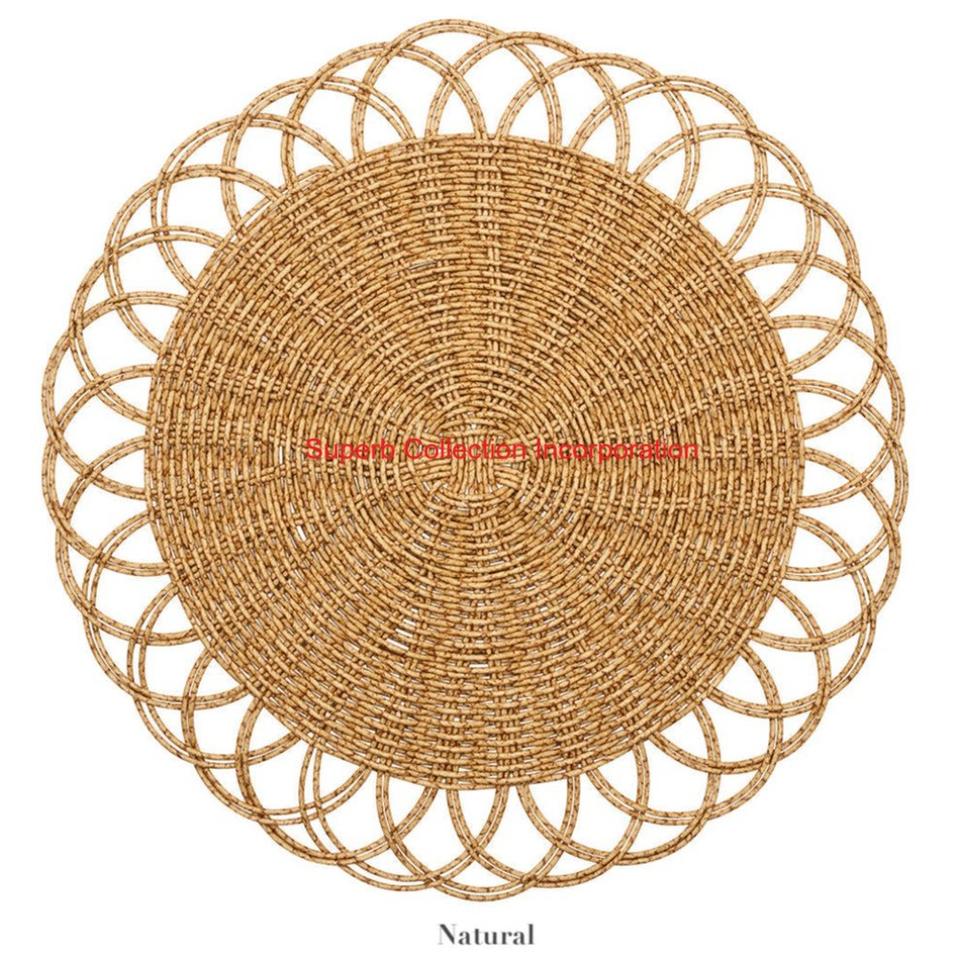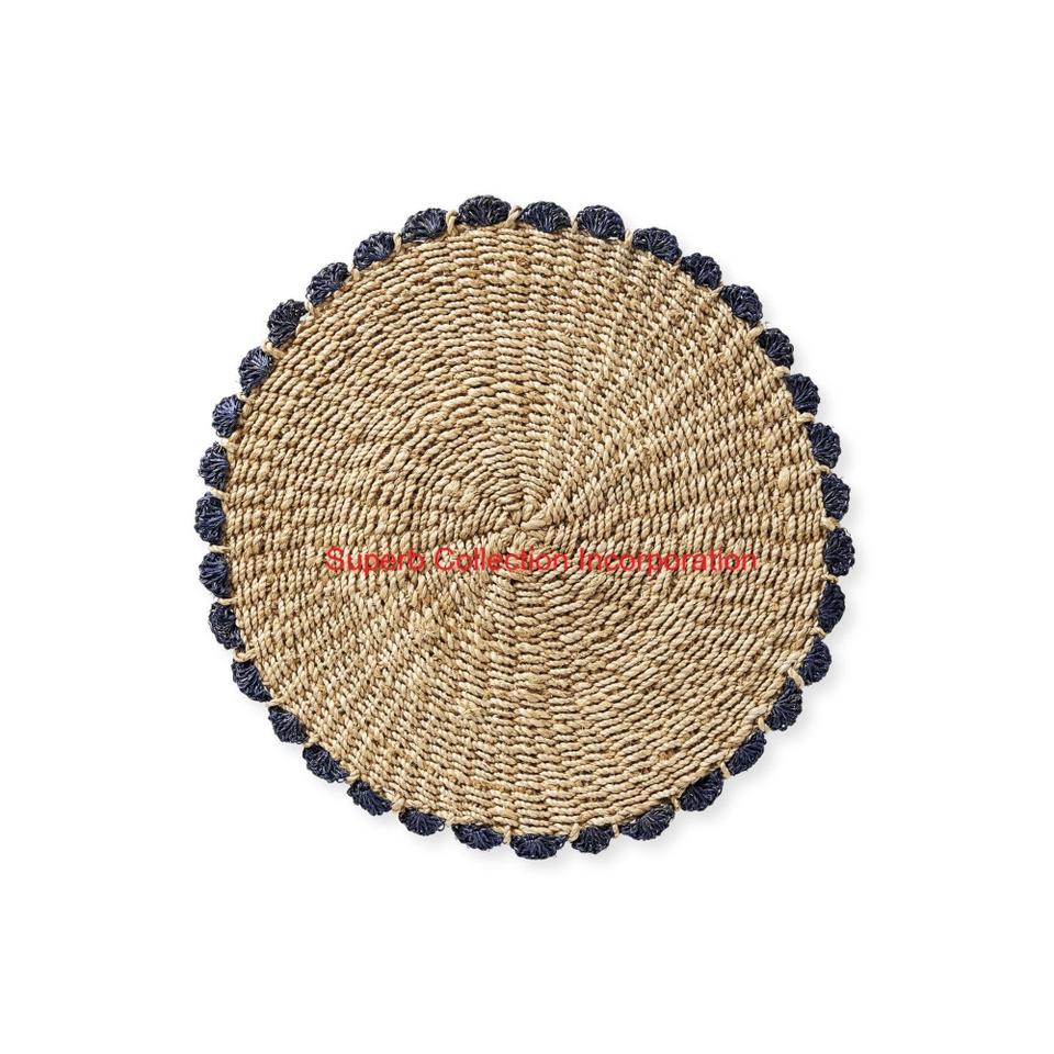 Napperon rond moderne en fibre naturelle tissée à la main avec bord festonné bleu marine pour la décoration de table à manger côtière et bohème