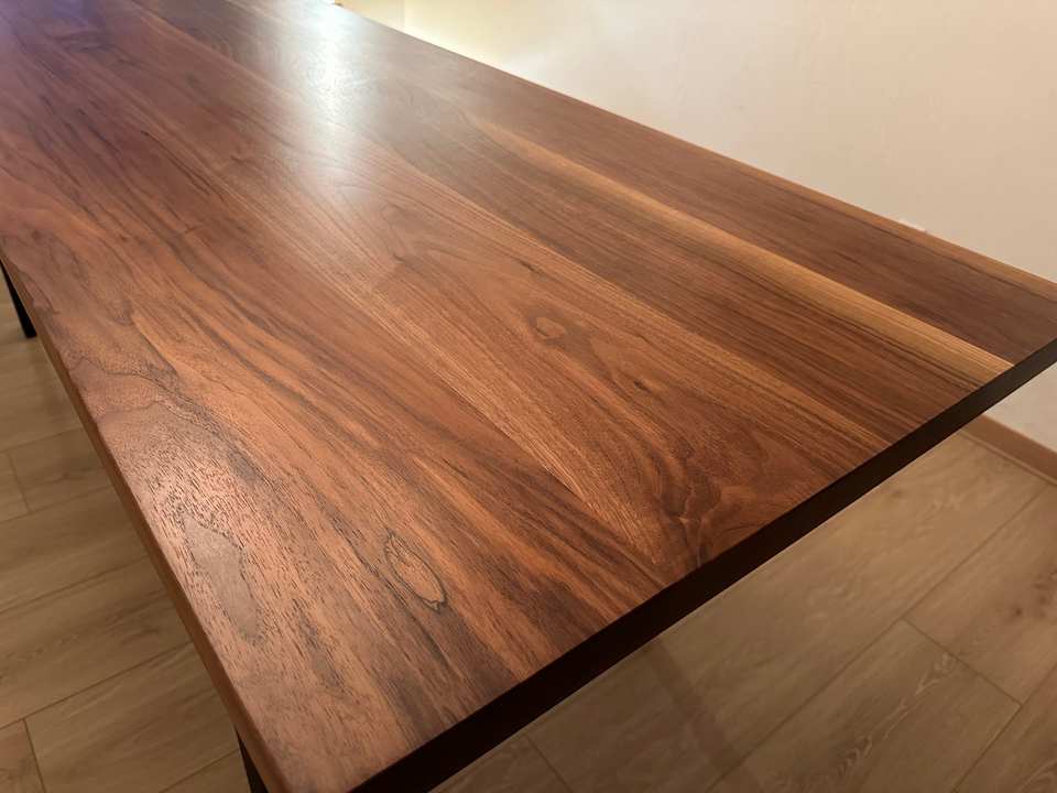 Table à manger moderne en bois de noyer massif, artisanat de qualité supérieure, design minimaliste avec pieds en métal noir pour les intérieurs de maison