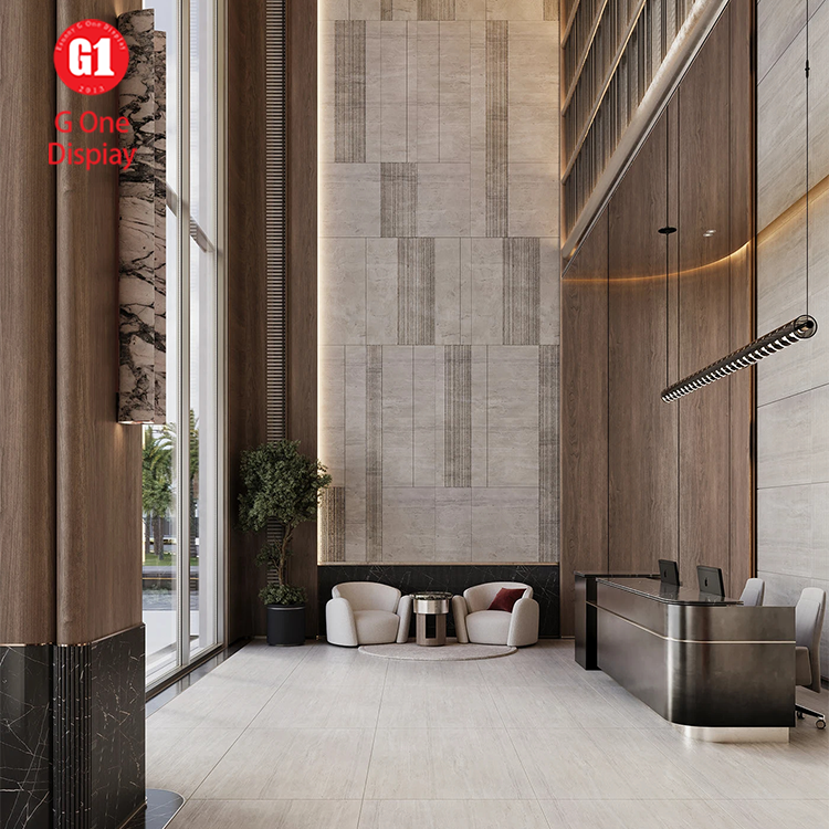 Design moderne de hall d'hôtel, vitrines exclusives, canapés élégants, mobilier d'hôtel luxueux, comptoirs de bar sur mesure