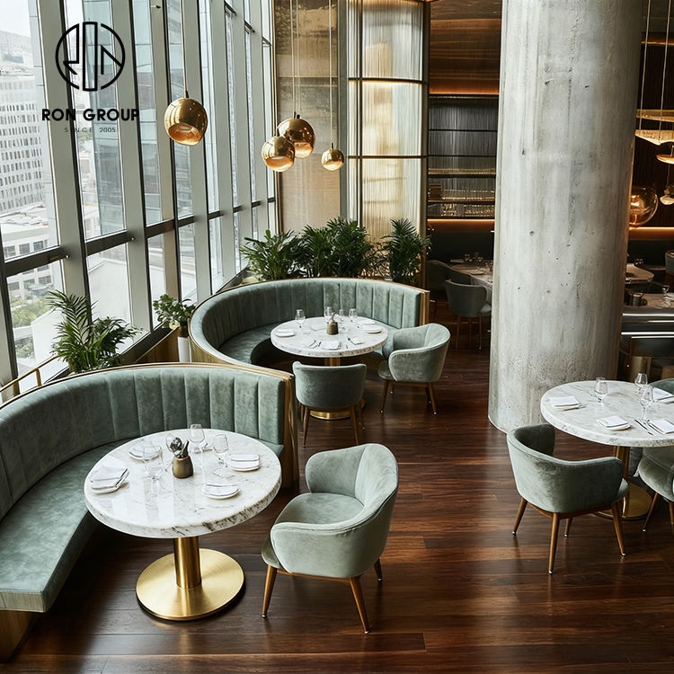 Canapé moderne en velours courbé avec table et chaises en marbre rond pour café, restaurant et espace de restauration