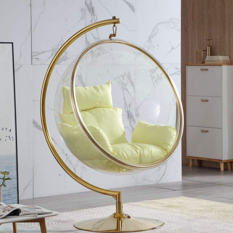 Fauteuil suspendu à bulles transparent en acrylique moderne et personnalisable pour patio extérieur avec cadre en métal et ensemble de coussins