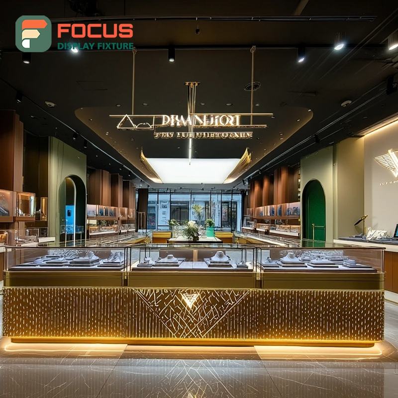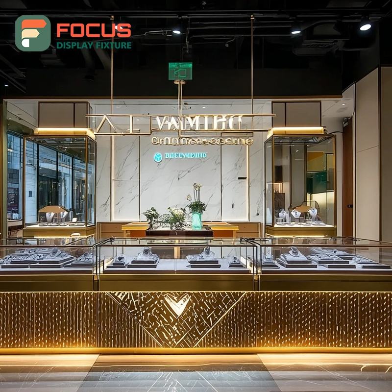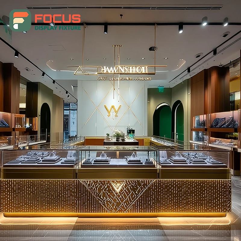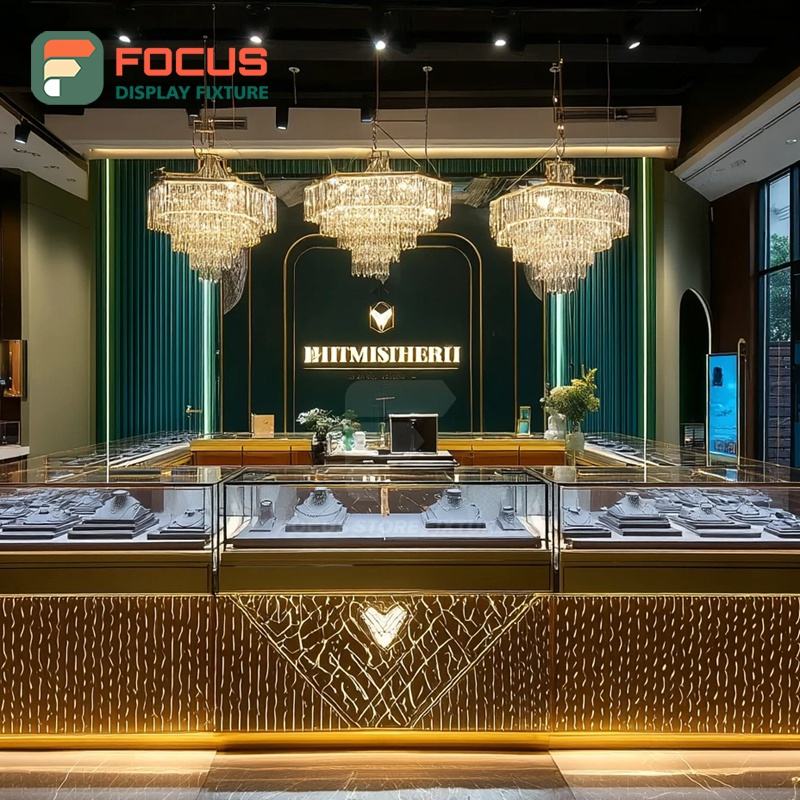 Système de vitrine de présentation de bijoux modernes avec finition stratifiée, comptoir de centre commercial, vitrine en verre