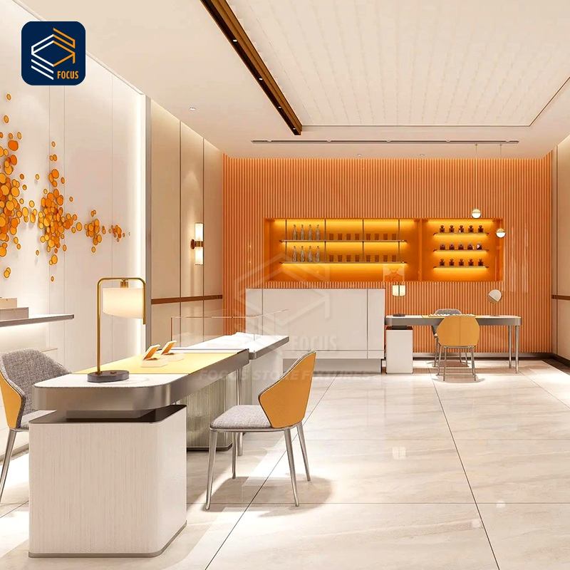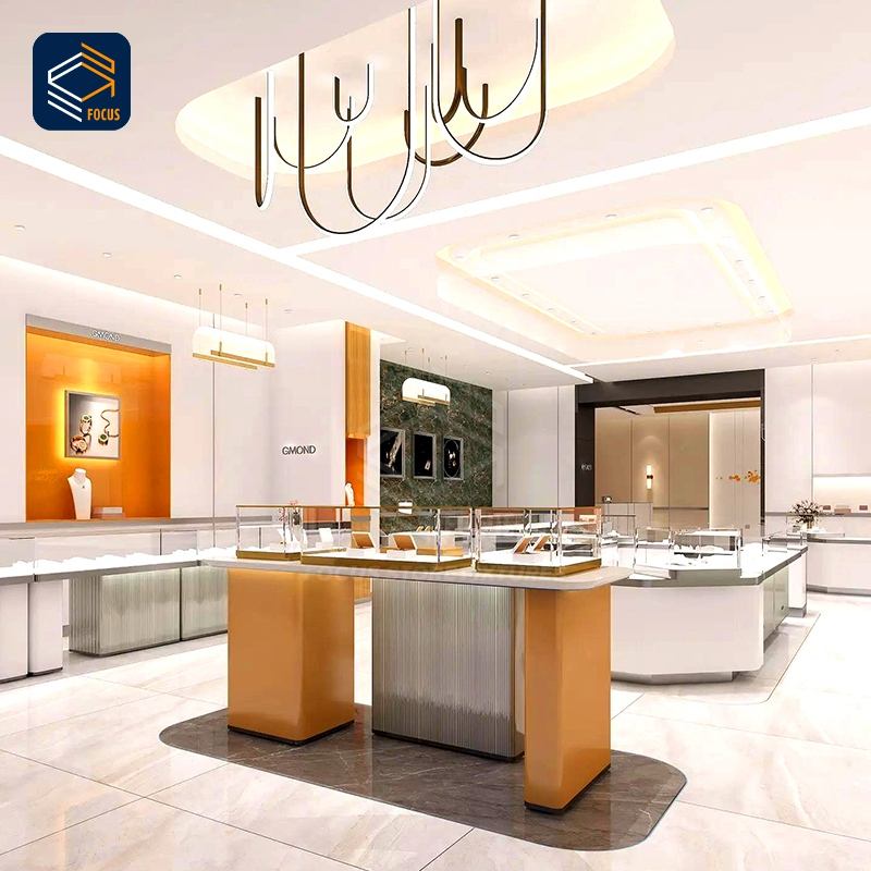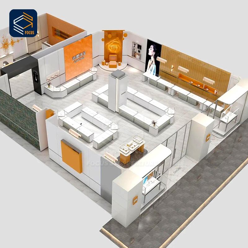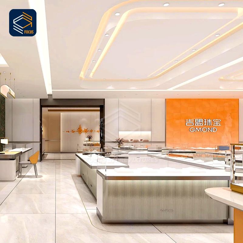 Comptoir d'exposition moderne pour bijouterie avec vitrine en verre et design d'armoire blanc et orange