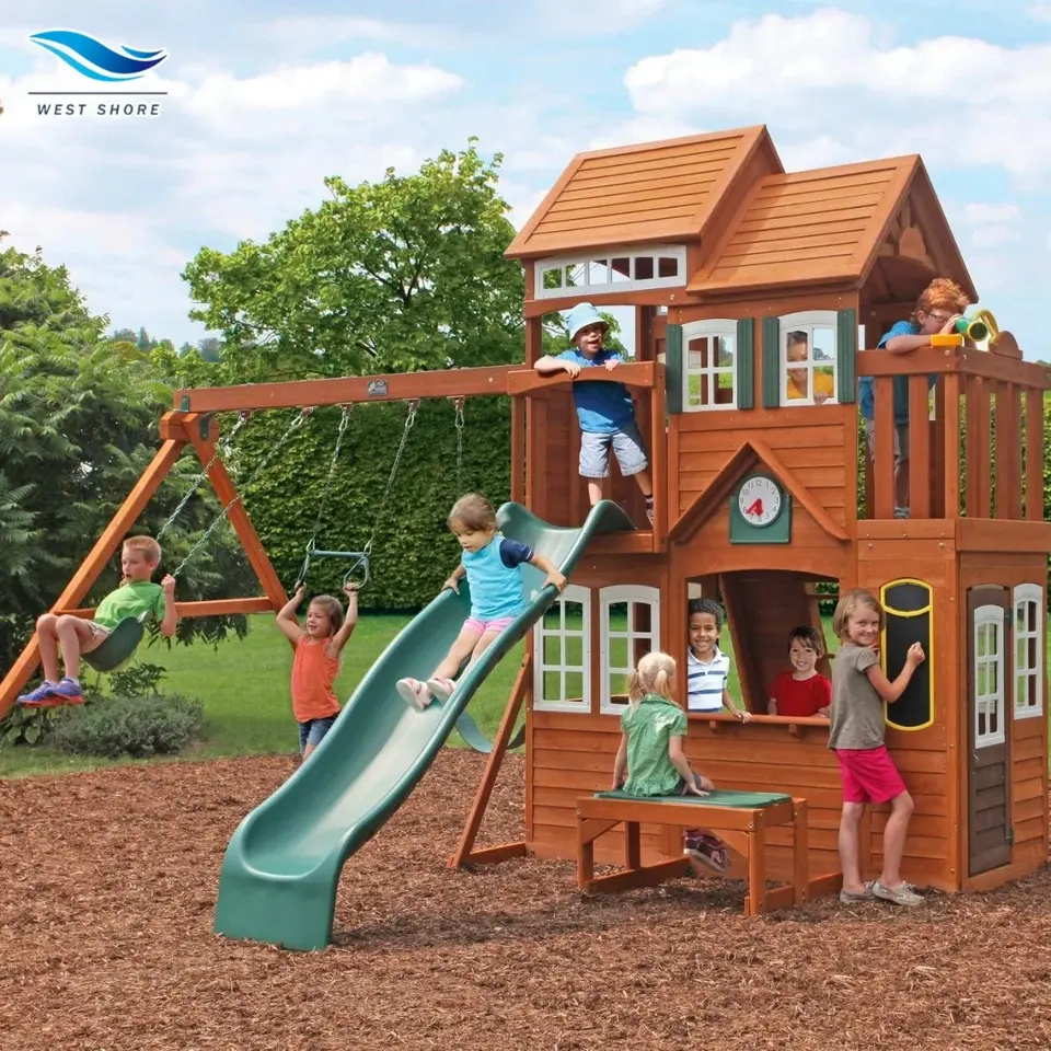Maison de jeu Montessori d'extérieur avec table en bois, rideaux et fenêtres pour jardin préscolaire, cour arrière, chalet d'activités pour tout-petits