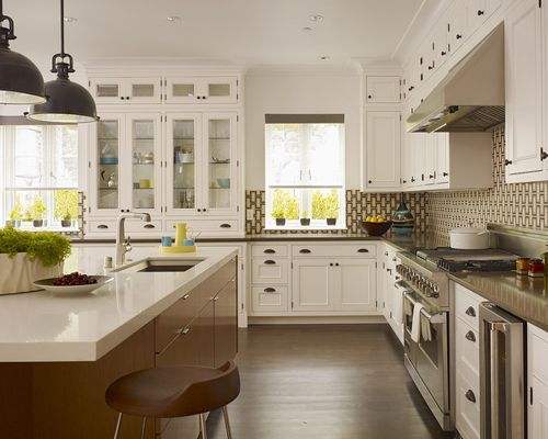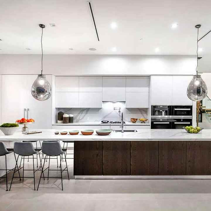 Meubles de cuisine modernes, armoires en bois massif, îlot central, portes d'armoires, panneaux standard américains, stratifié, charnières, glissières de tiroirs