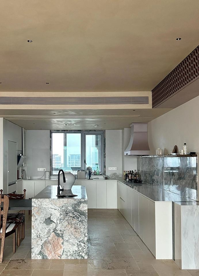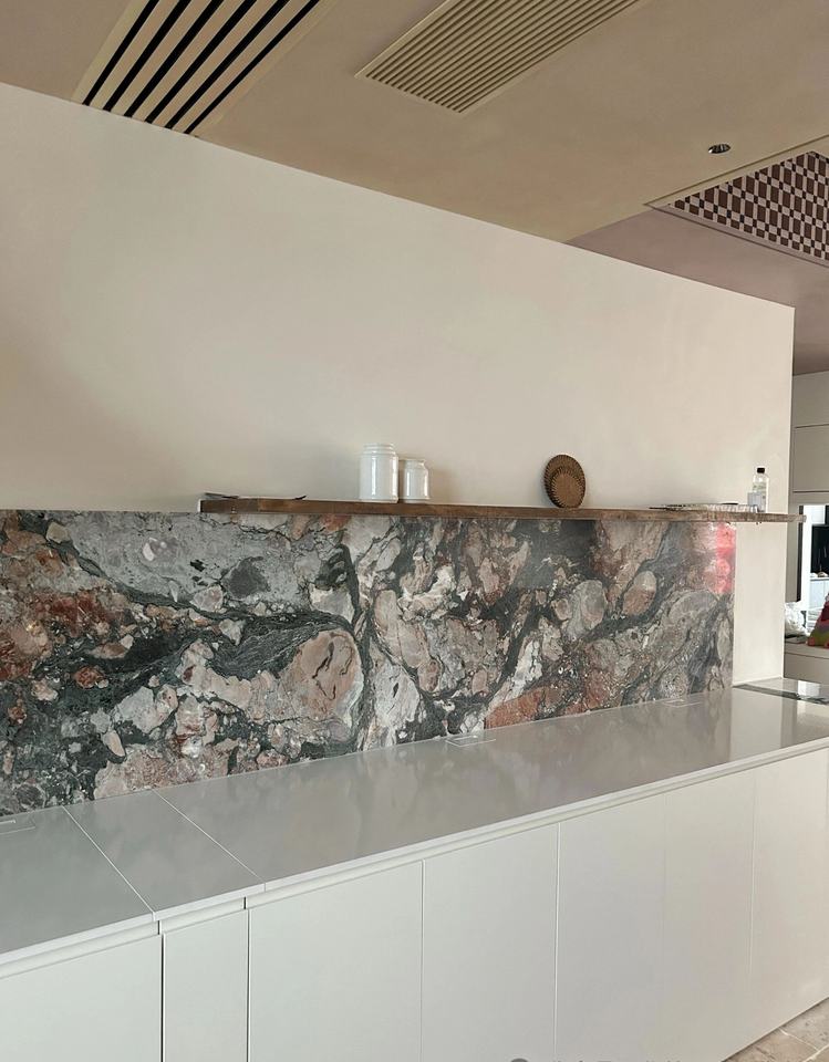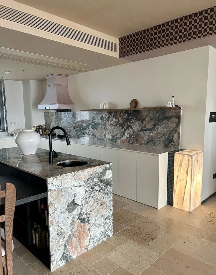 Cuisine moderne avec crédence en pierre naturelle et îlot, armoires blanches, étagères ouvertes