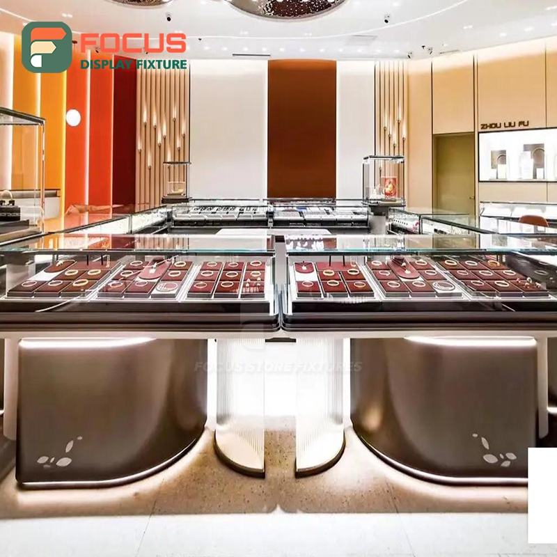 Modern LED Light Glass Display Cabinet Wooden Jewelry Counter Luxury High End Premium Jewelry Display Shelves