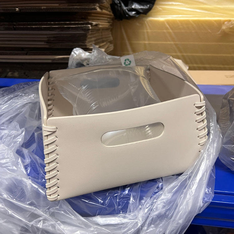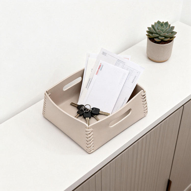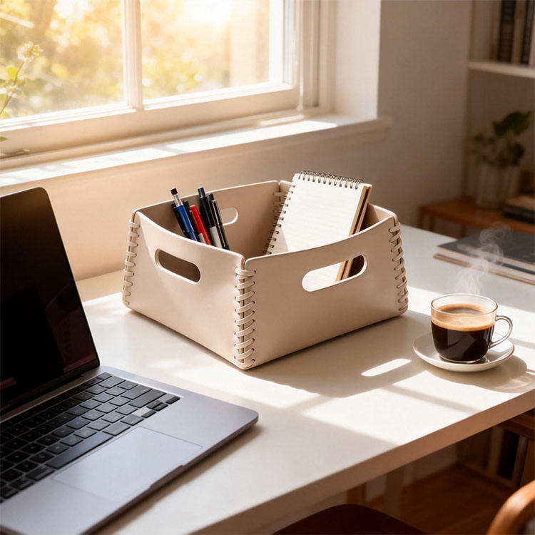 Panier de rangement moderne en similicuir beige avec poignée découpée et surpiqûres décoratives