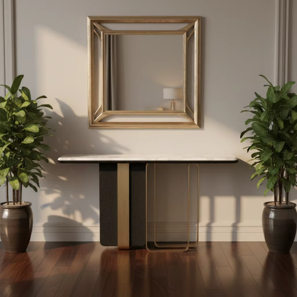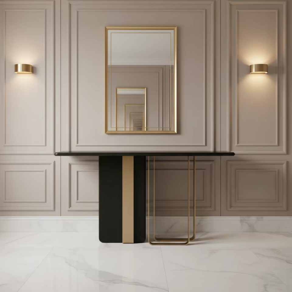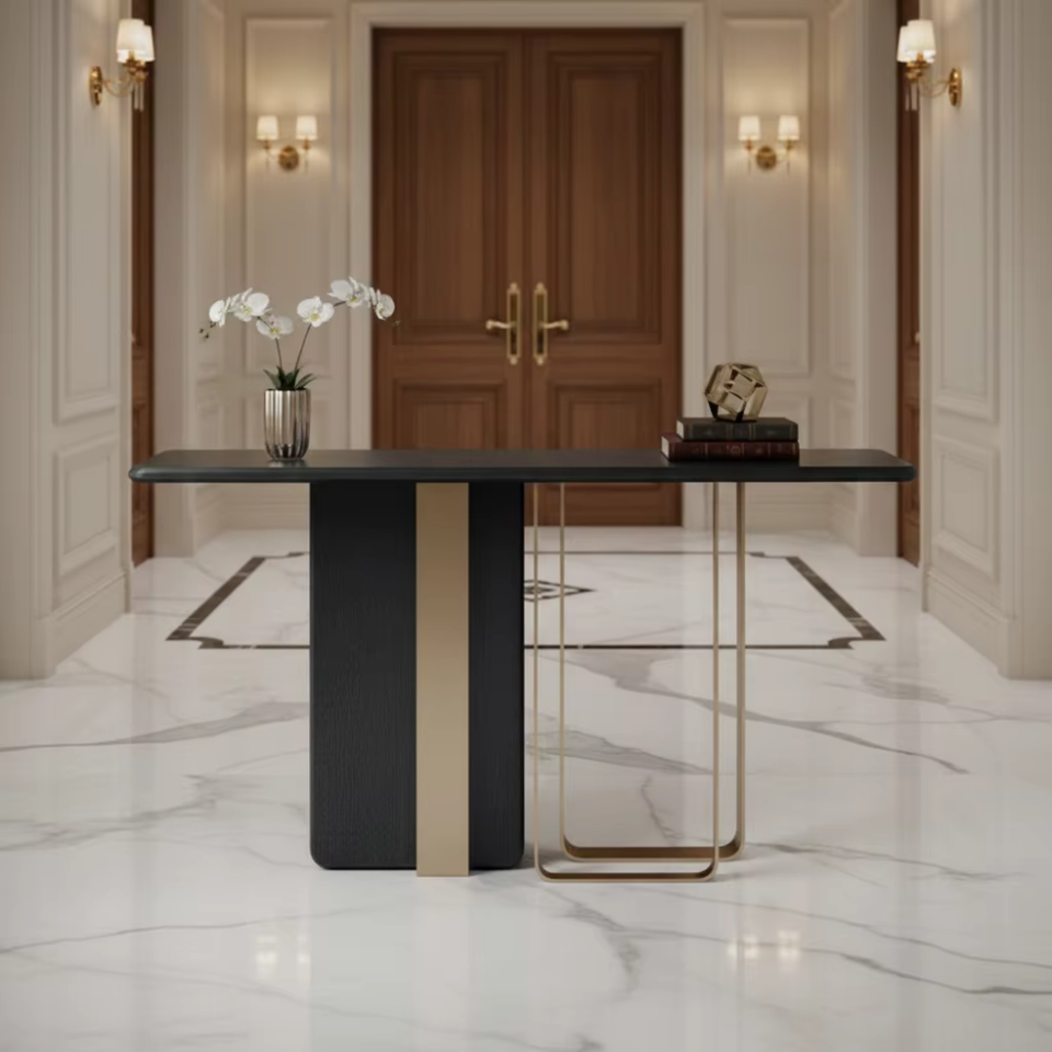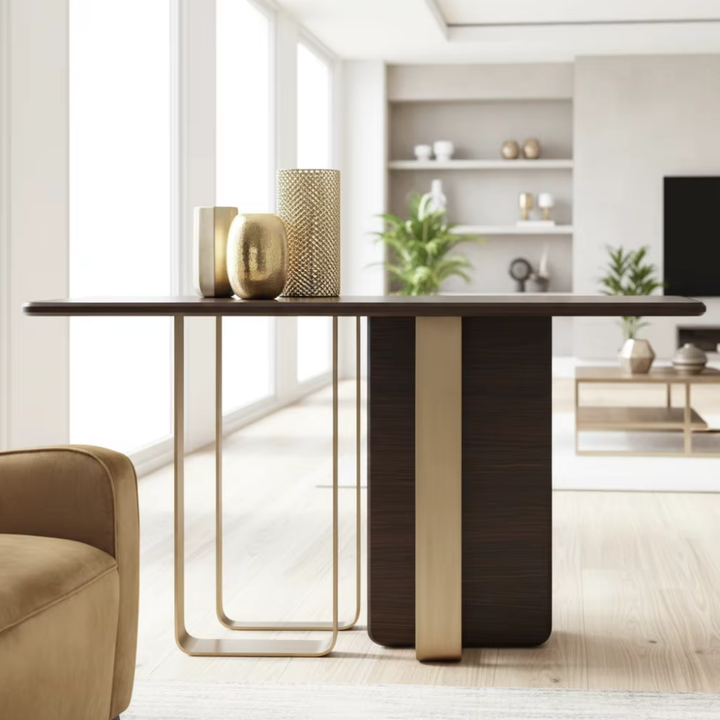 Table console asymétrique moderne de luxe léger | Table d'entrée en bois et acier inoxydable pour la décoration de l'entrée d'un bar à vin boutique