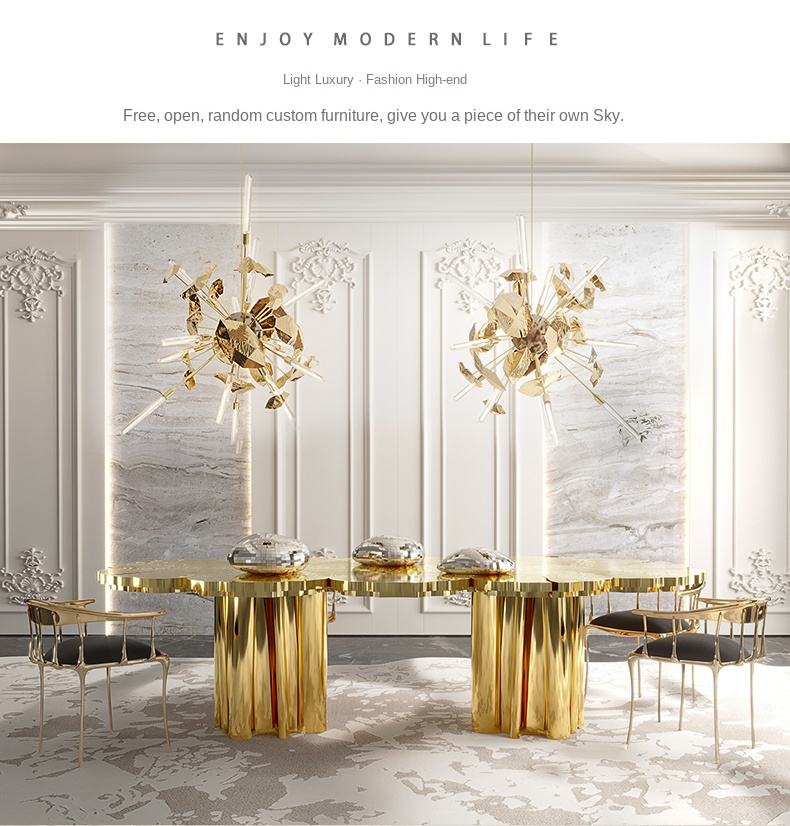 Table à manger moderne et légère de luxe en acier inoxydable et métal de style nordique personnalisé de forme spéciale haut de gamme pour le salon