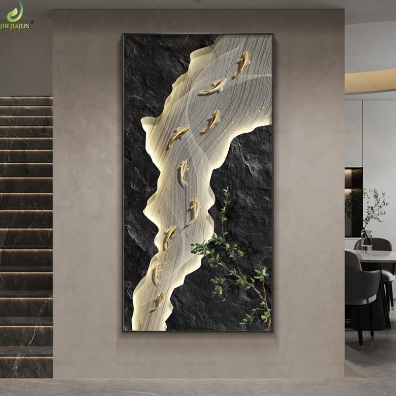 Peinture sur Porcelaine Cristalline Paysage Moderne Luxe Léger avec Neuf Poissons, Décoration Murale pour Fond de Canapé de Salon
