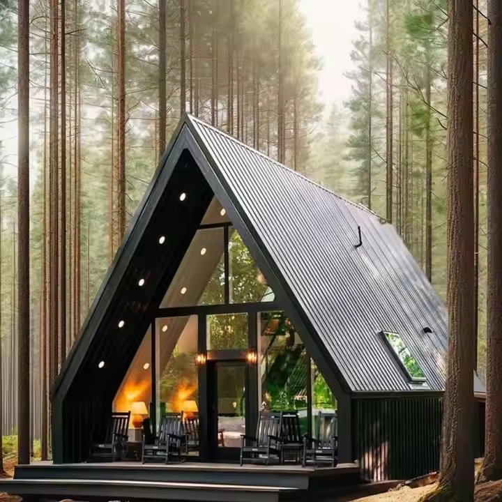 Villa contemporaine préfabriquée en acier léger de style A-frame avec un design écologique et durable pour la vie de famille, salon et chambre à coucher