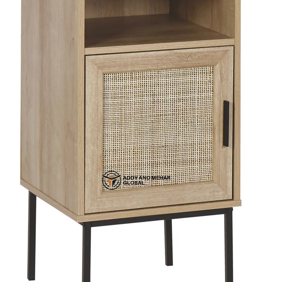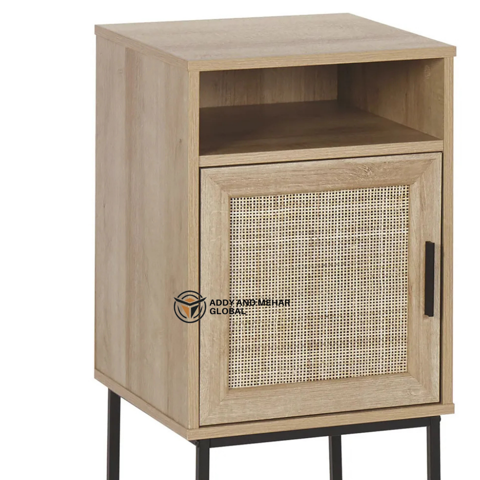 Table de chevet moderne en bois clair avec porte en rotin, table de nuit minimaliste avec étagère de rangement et pieds en métal, style scandinave