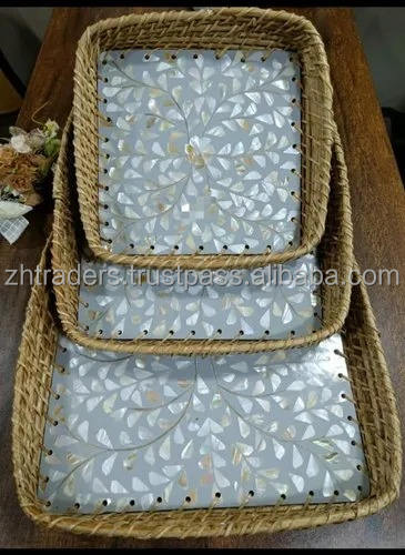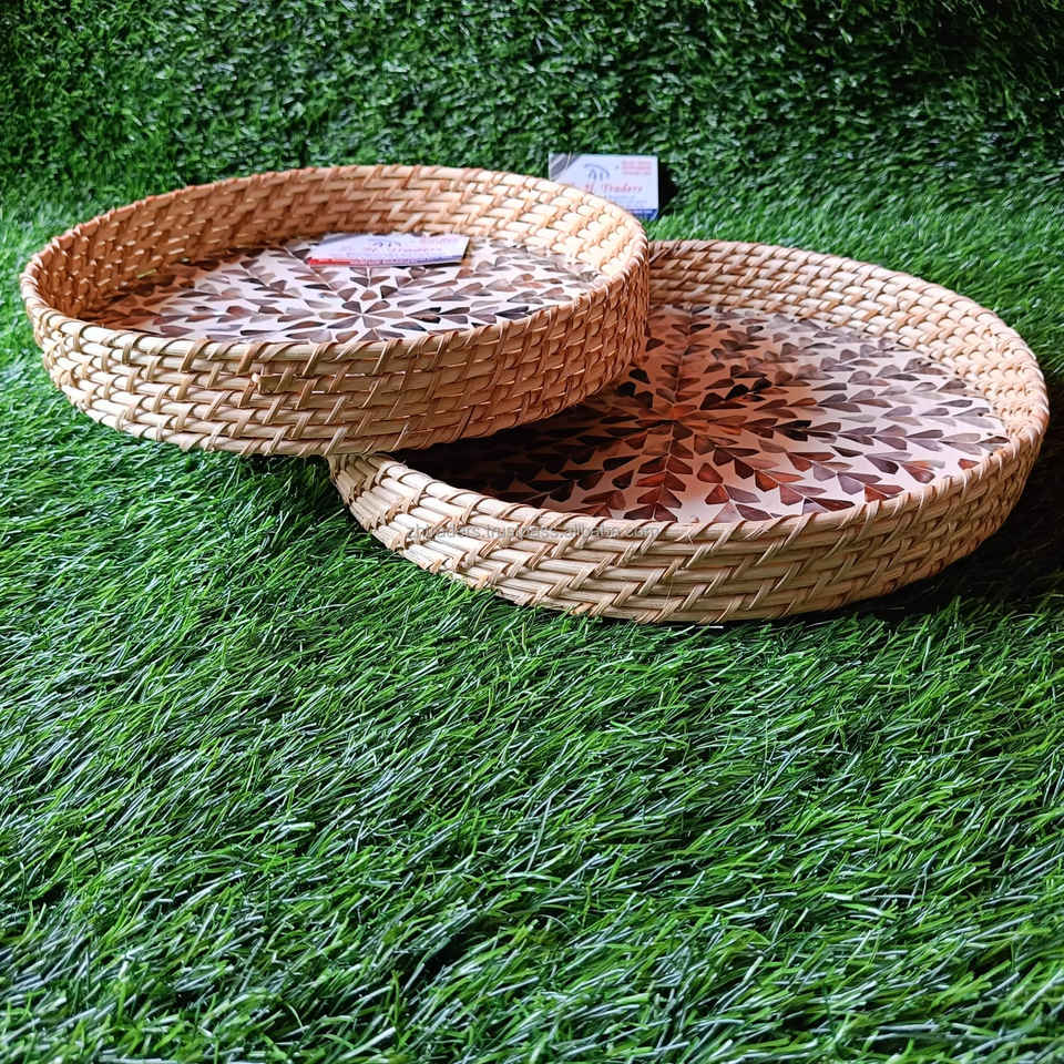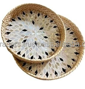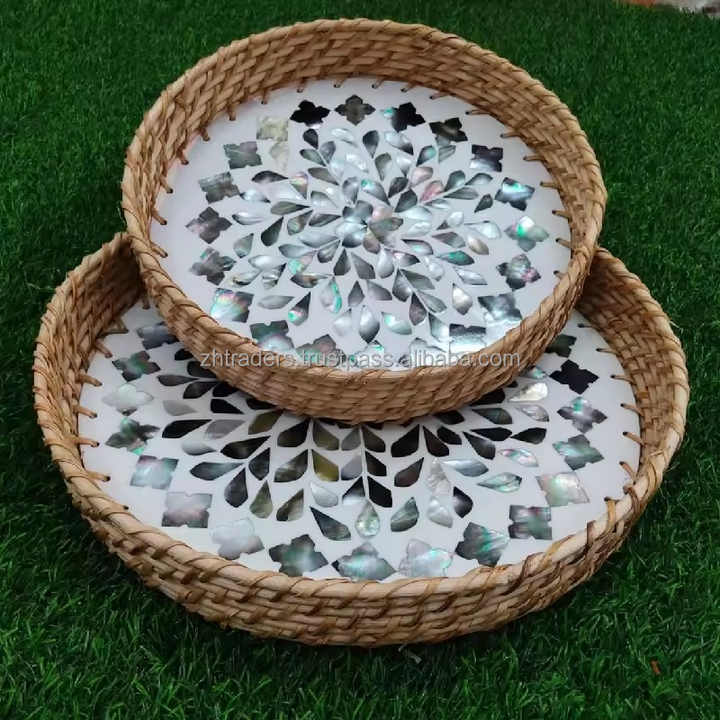 Plateau de service rond en métal avec poignée, incrusté de nacre, pour la décoration de la maison/la cuisine, occasion Ramadan et Diwali