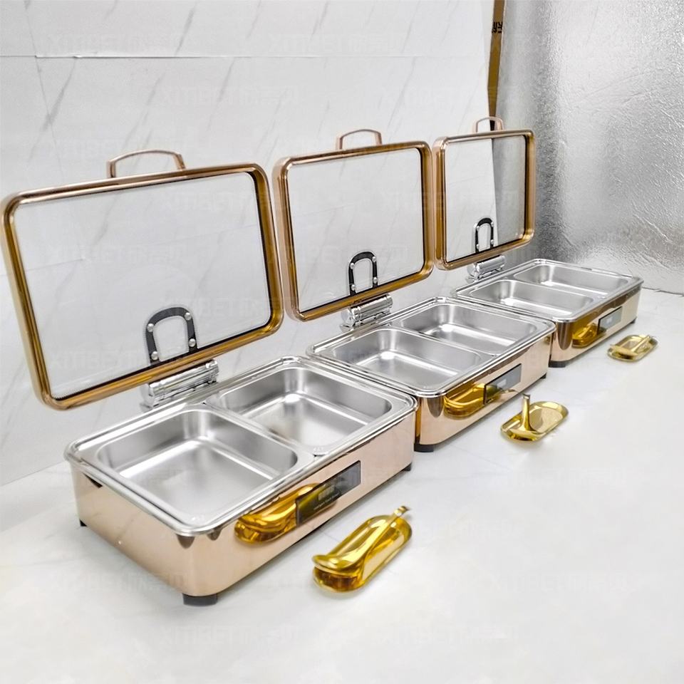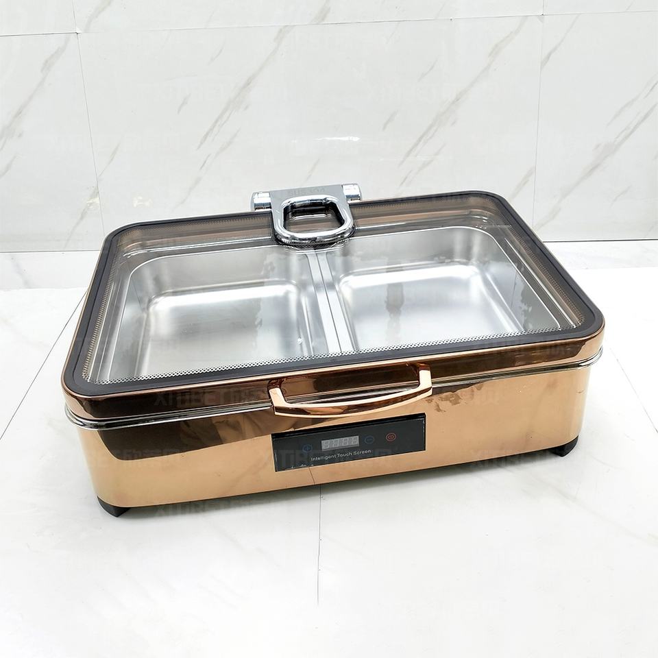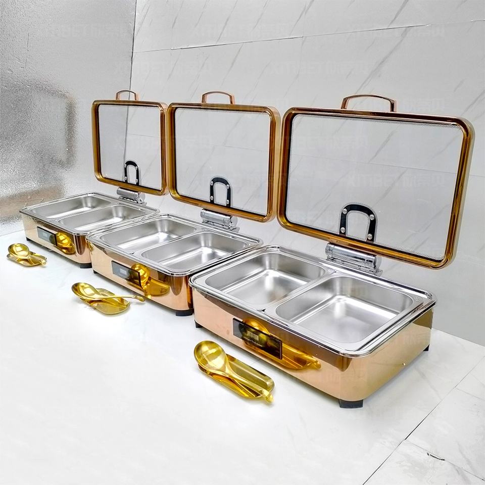 Modern Luxury 9L Rose Gold Stainless Steel Rectangle Chafing Dish Electric Heating 600W Food Buffet Display Warmer Set Wedding