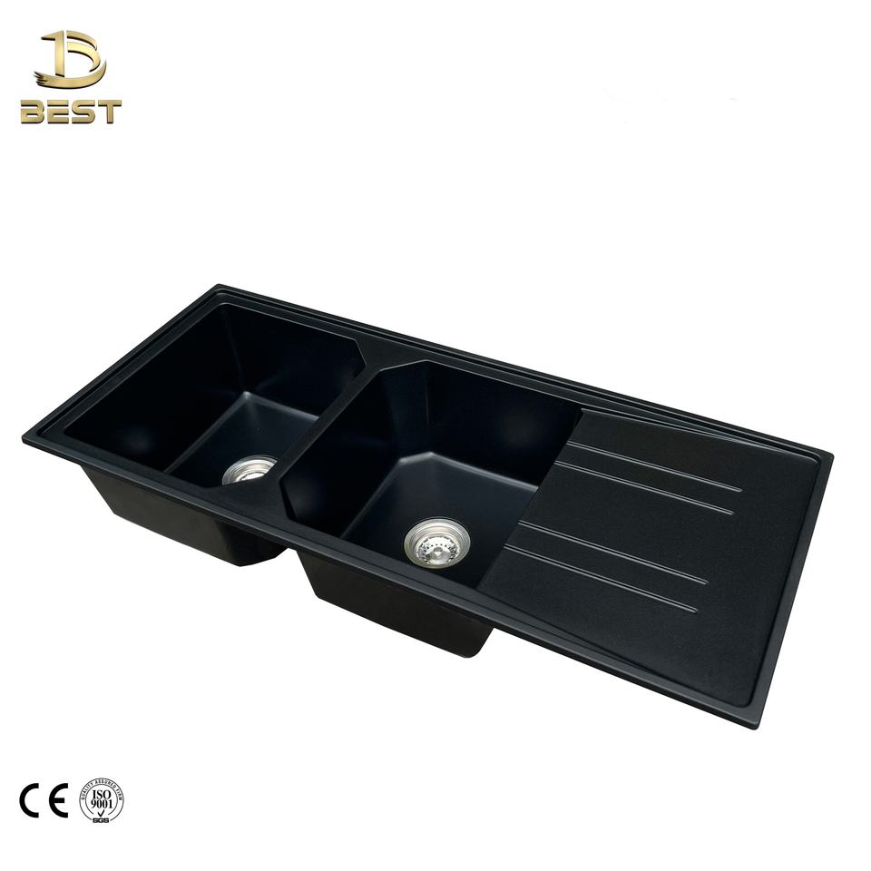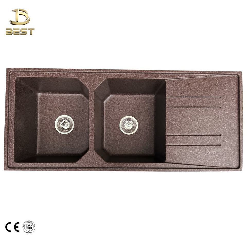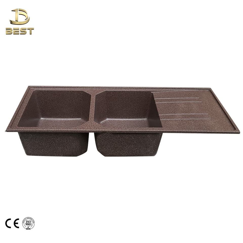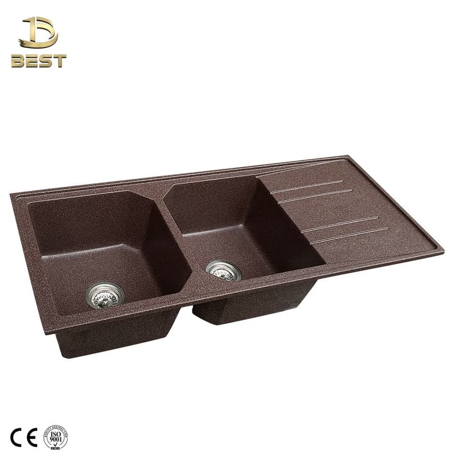 Évier de cuisine moderne de luxe à double cuve encastré en marbre de quartz fabriqué au Vietnam, deux robinets à un trou pour usage commercial