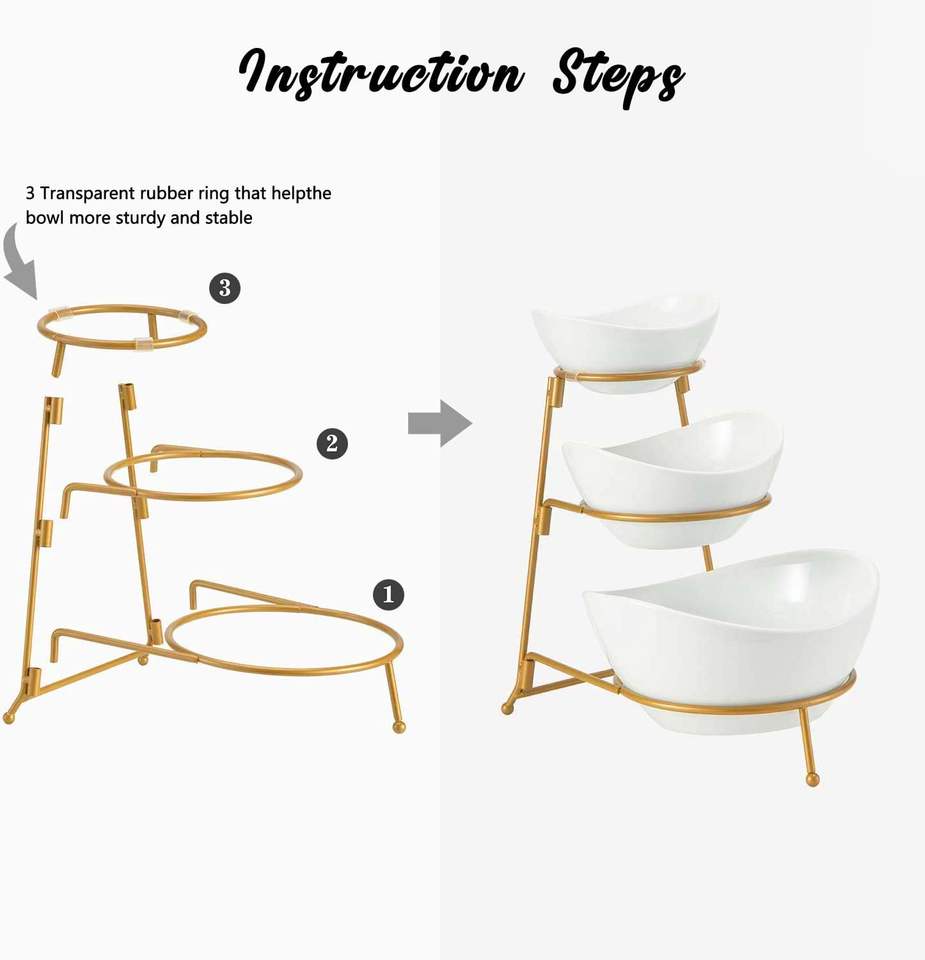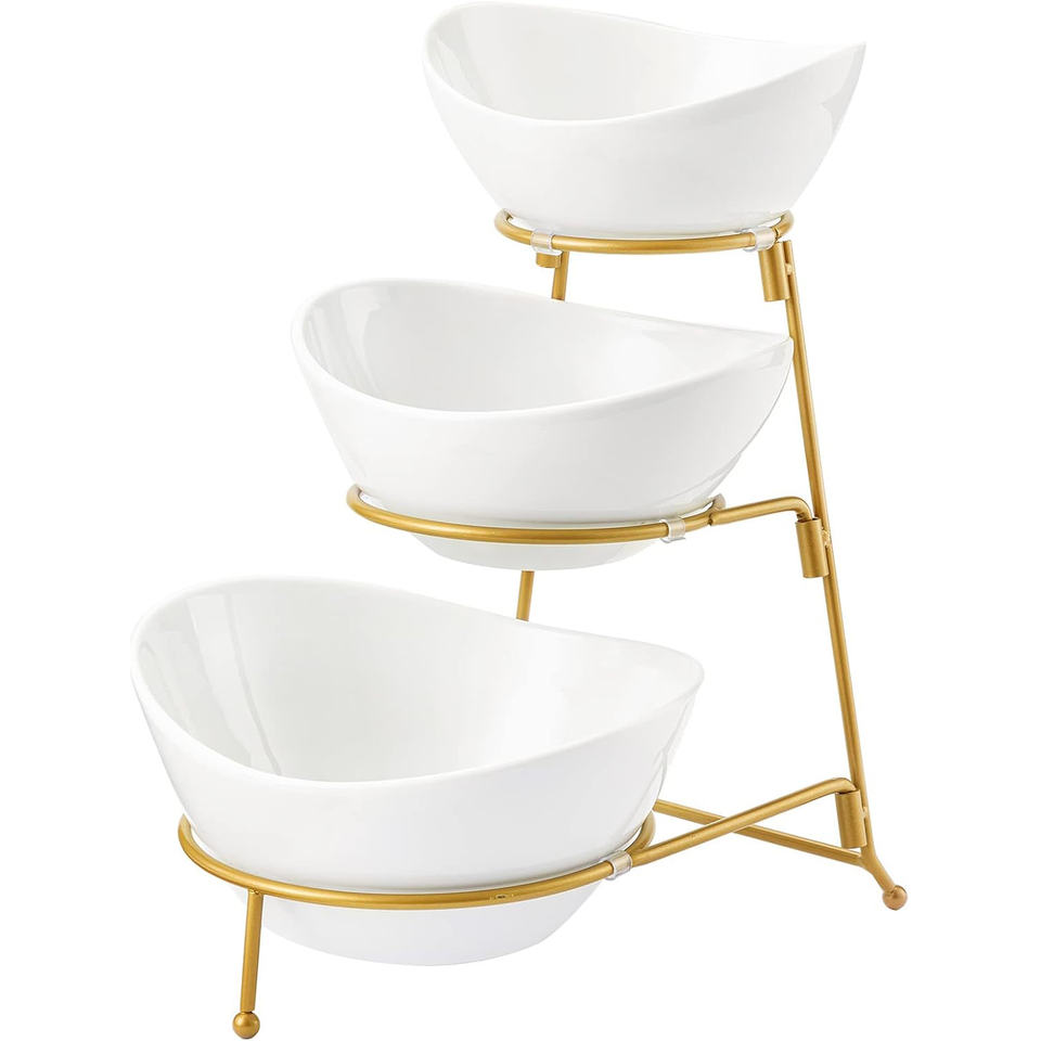 Ensemble de bols à fruits en porcelaine écologiques jetables de luxe moderne avec motif incrusté d'or, plateau de service ovale, support métallique, pack de trois plats