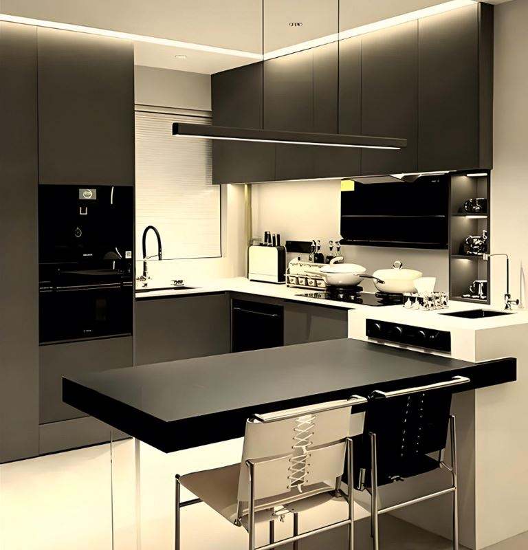 Armoires de cuisine modernes de luxe, portes de cuisine en bois massif mélaminé, îlot unique, peinture brillante, armoires latérales de salle à manger